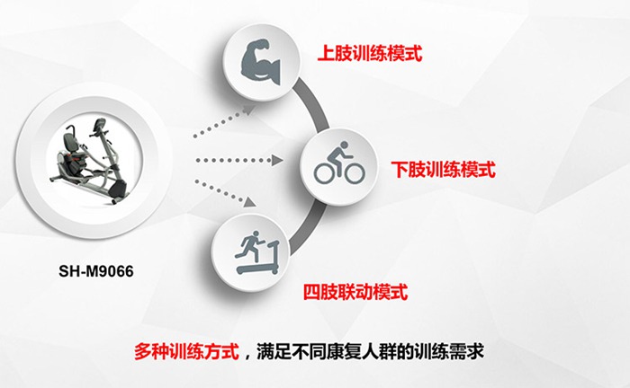 快盈VIII健身器材-四肢聯(lián)動(dòng)器械 可通過上肢帶動(dòng)下肢,健側(cè)帶動(dòng)患側(cè),一肢帶動(dòng)三肢、上肢伸夠、下肢蹬踏的基礎(chǔ)的功能性四肢聯(lián)動(dòng)訓(xùn)練方式解決零肌力患者早期的主動(dòng)康復(fù)訓(xùn)練;滿足患者全身功能性、協(xié)調(diào)性的運(yùn)動(dòng)訓(xùn)練需求;提供了早期的有氧訓(xùn)練,并自帶心率監(jiān)控裝置,通過設(shè)定靶心率保證訓(xùn)練安全和效果;安全的主動(dòng)運(yùn)動(dòng),保證患者訓(xùn)練安全,并可加快本體感覺的恢復(fù)。