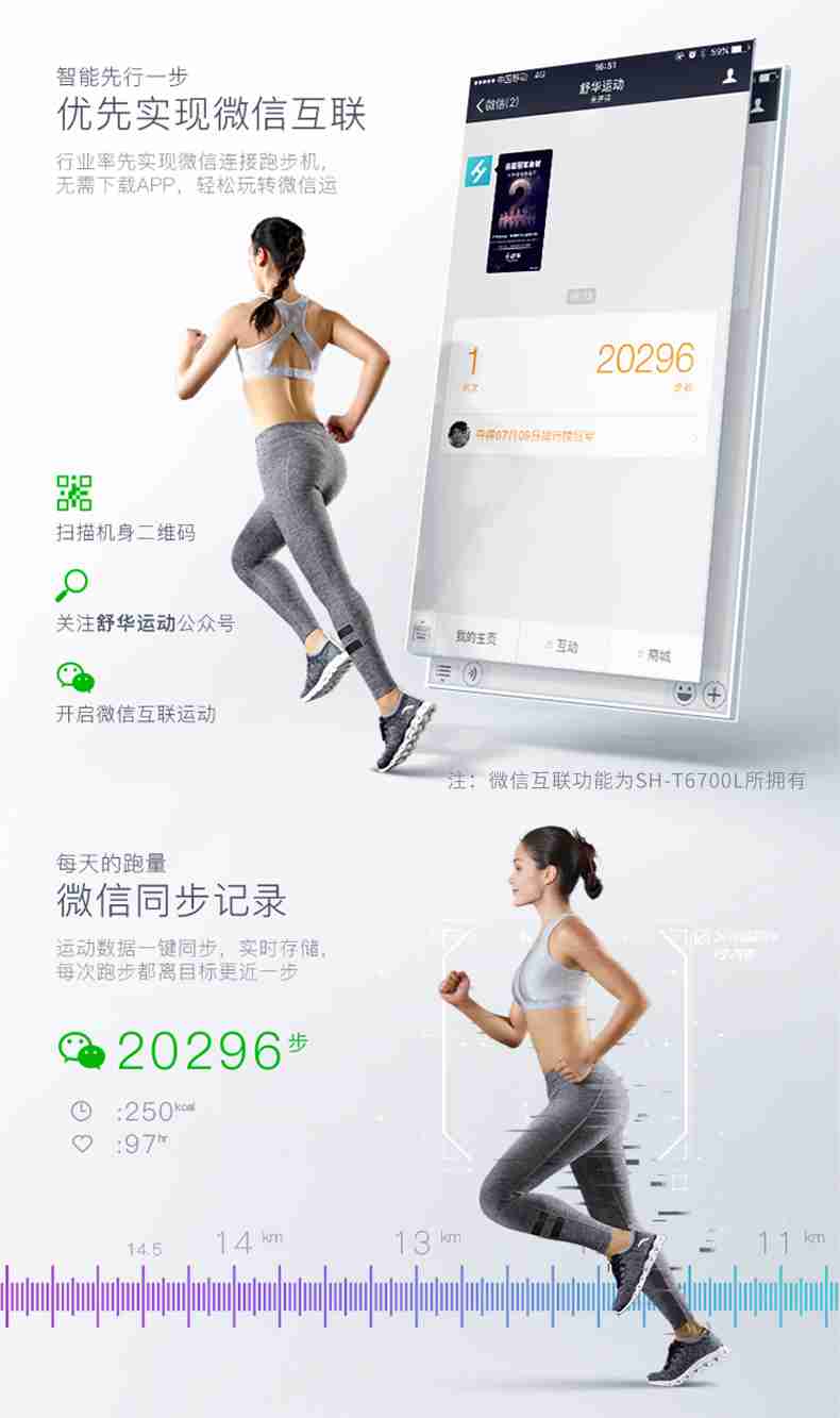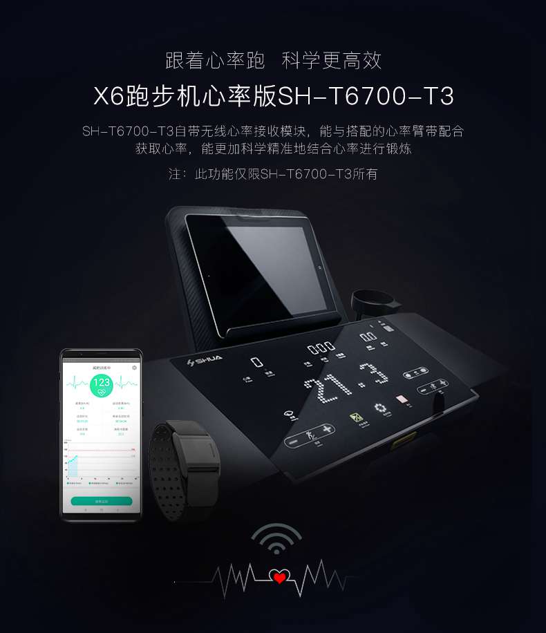 SH-T6700-T3跑步機為了幫助用戶進行更加科學(xué)有效的運動,搭載快盈VIIIAPP連接心率臂帶實現(xiàn)心率控制,通過監(jiān)測運動心率從而實現(xiàn)科學(xué)運動。
