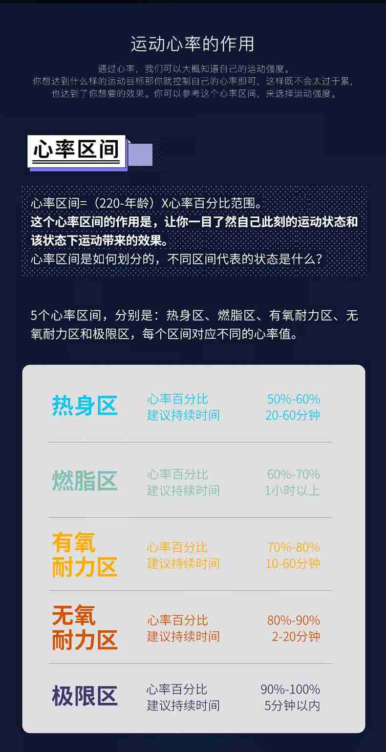 通過監(jiān)控心率來控制運動量是非常重要的,正如人體其他器官一樣,心血管系統(tǒng)也只有在一定的運動強度刺激下才能得到改善,但這個強度又不能太高,否側(cè)就變成了無氧代謝運動。