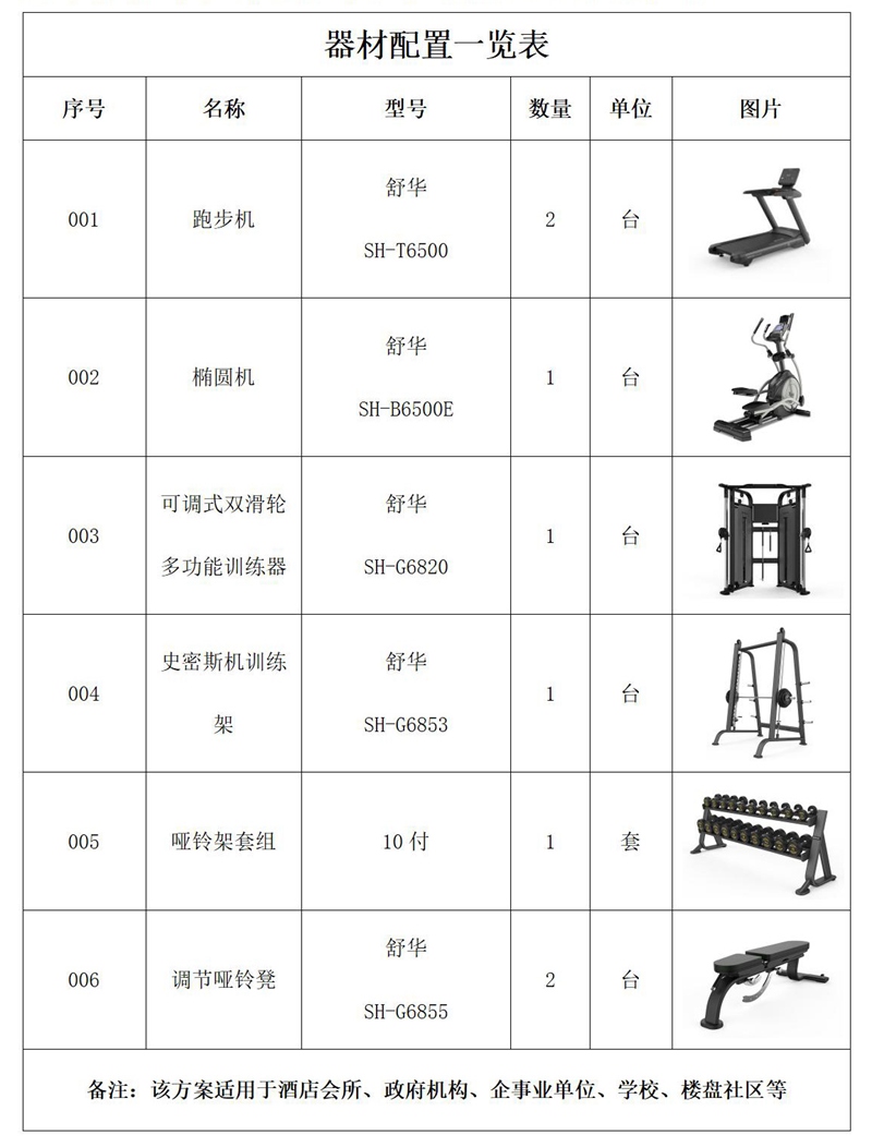 此方案要求面積小于40平米,我們會(huì)根據(jù)您個(gè)人的實(shí)際情況和場(chǎng)地面積而定。此方案推薦小型單位健身房、酒店會(huì)所健身房配置。能滿足5-10人同時(shí)健身使用。