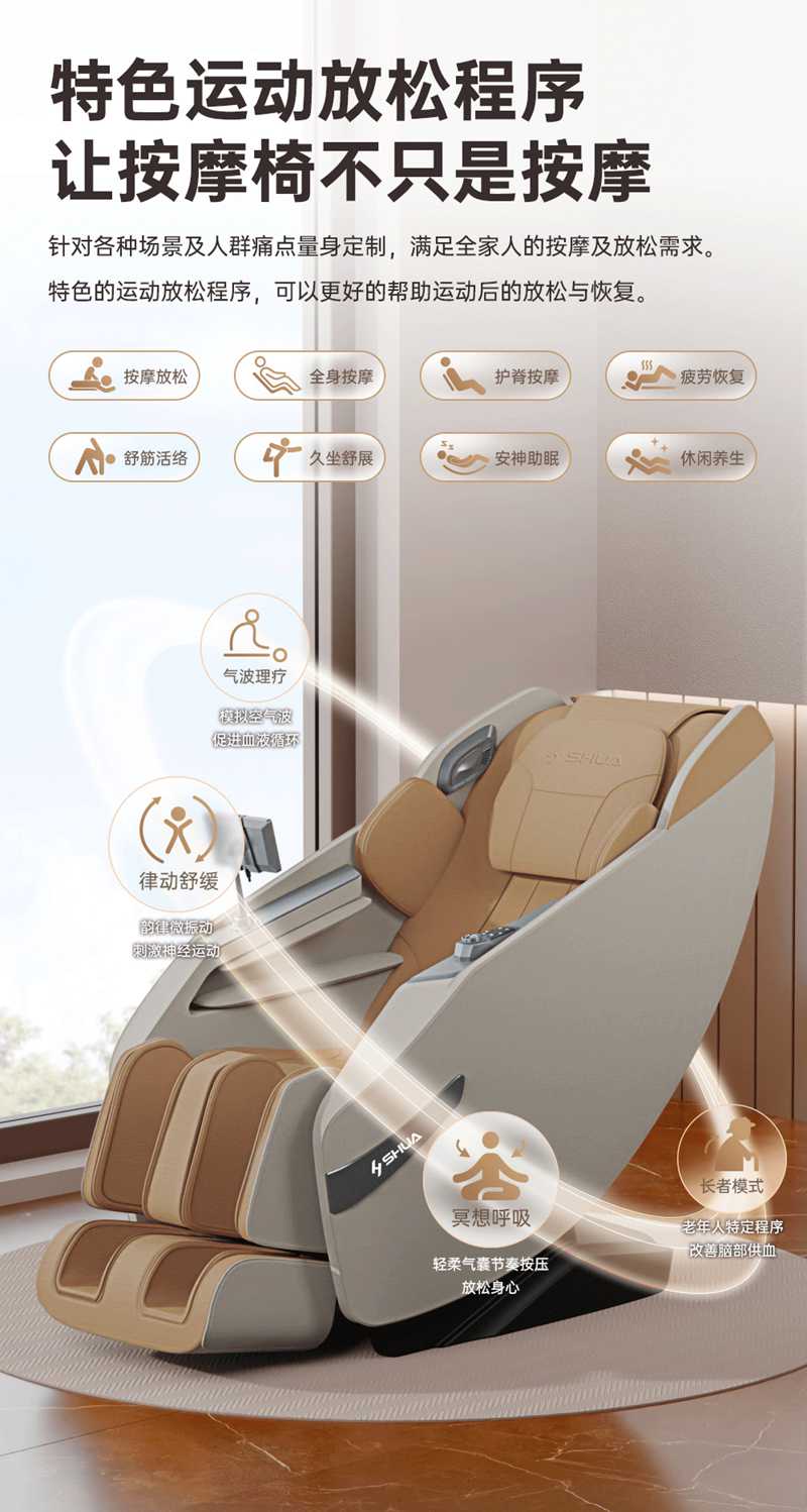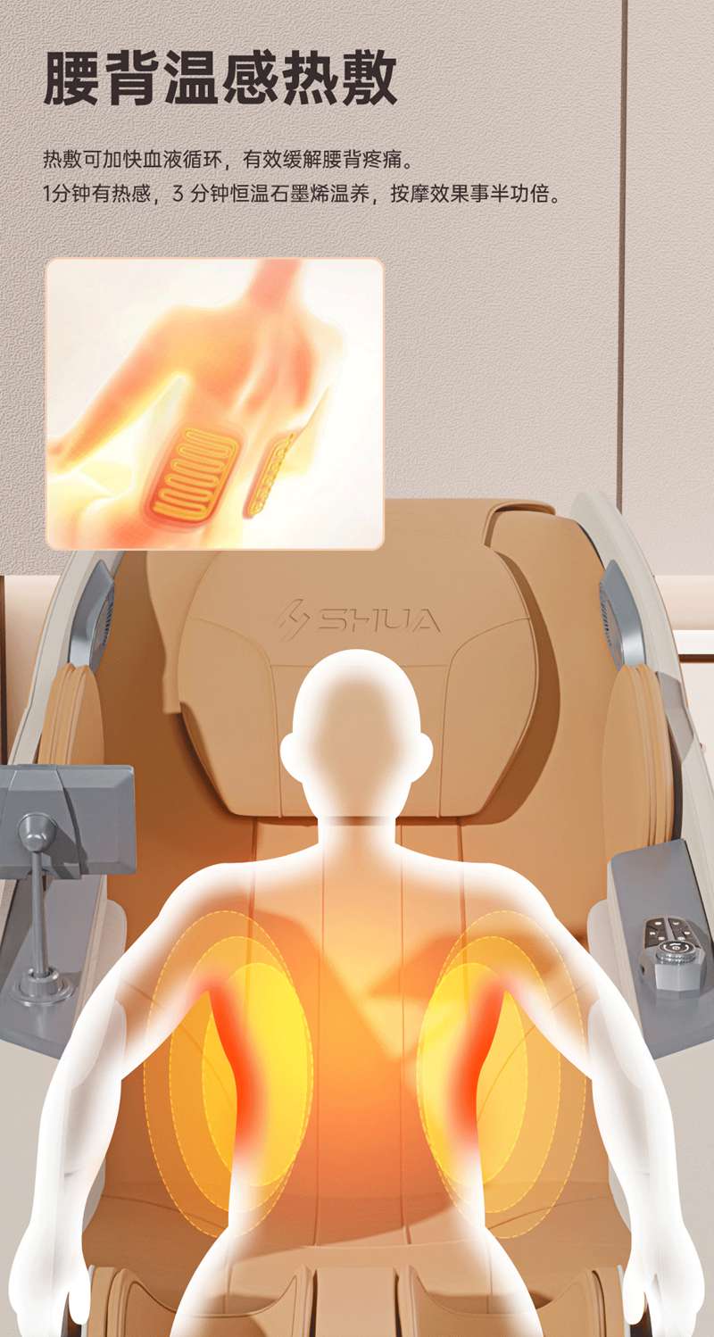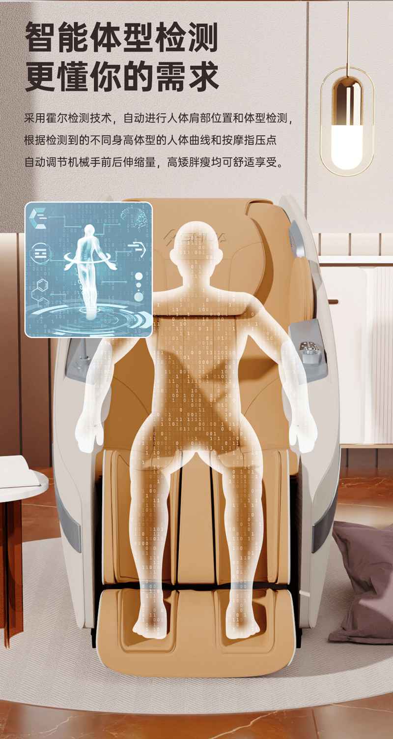 SH-M650 運動放松椅-4種運動放松特定程序,滿足不同人群和場景下的需求,12種按摩程序,融合現(xiàn)代科技與傳統(tǒng)按摩理念,提供精準力度和科學手法。定制135cmSL貼合7大部位27個點位,確保按摩全面深入,SL型導軌貼合人體背部曲線,提供精準舒適的按摩體驗,雙曲線導軌,高硬度,穩(wěn)固不易變形。采用霍爾檢測技術,通過多組傳感器自動識別人體曲線和按摩點,機械手自動調節(jié),適應不同身高體型,實現(xiàn)個性化按摩體驗。