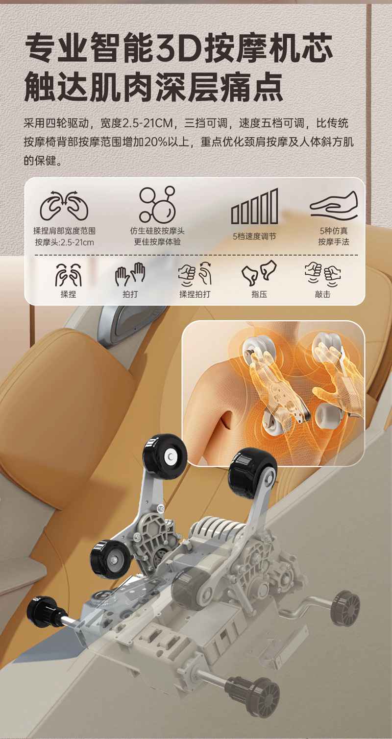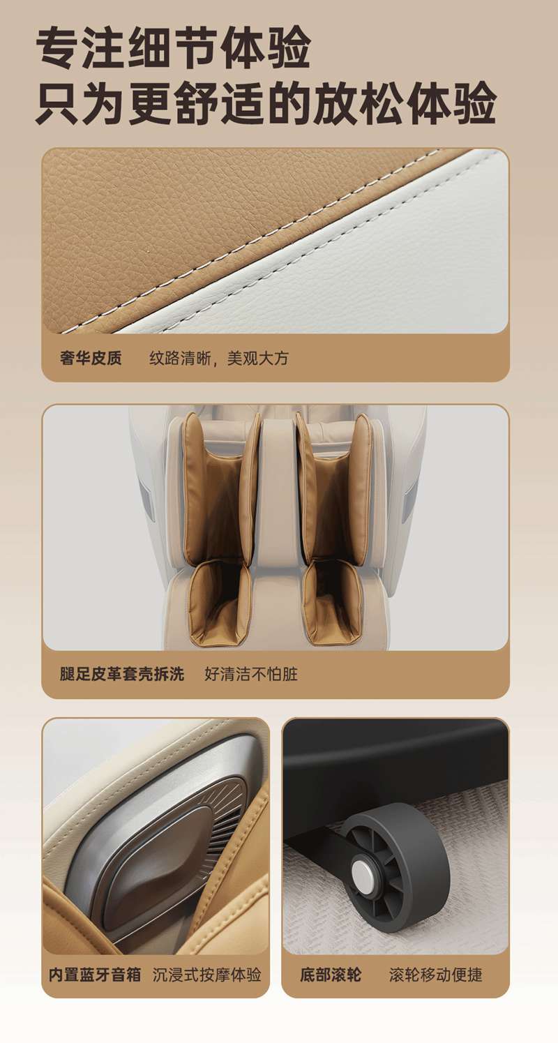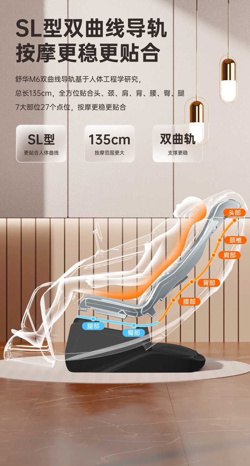 SH-M650 運動放松椅-4種運動放松特定程序,滿足不同人群和場景下的需求,12種按摩程序,融合現(xiàn)代科技與傳統(tǒng)按摩理念,提供精準力度和科學手法。定制135cmSL貼合7大部位27個點位,確保按摩全面深入,SL型導軌貼合人體背部曲線,提供精準舒適的按摩體驗,雙曲線導軌,高硬度,穩(wěn)固不易變形。采用霍爾檢測技術,通過多組傳感器自動識別人體曲線和按摩點,機械手自動調節(jié),適應不同身高體型,實現(xiàn)個性化按摩體驗。