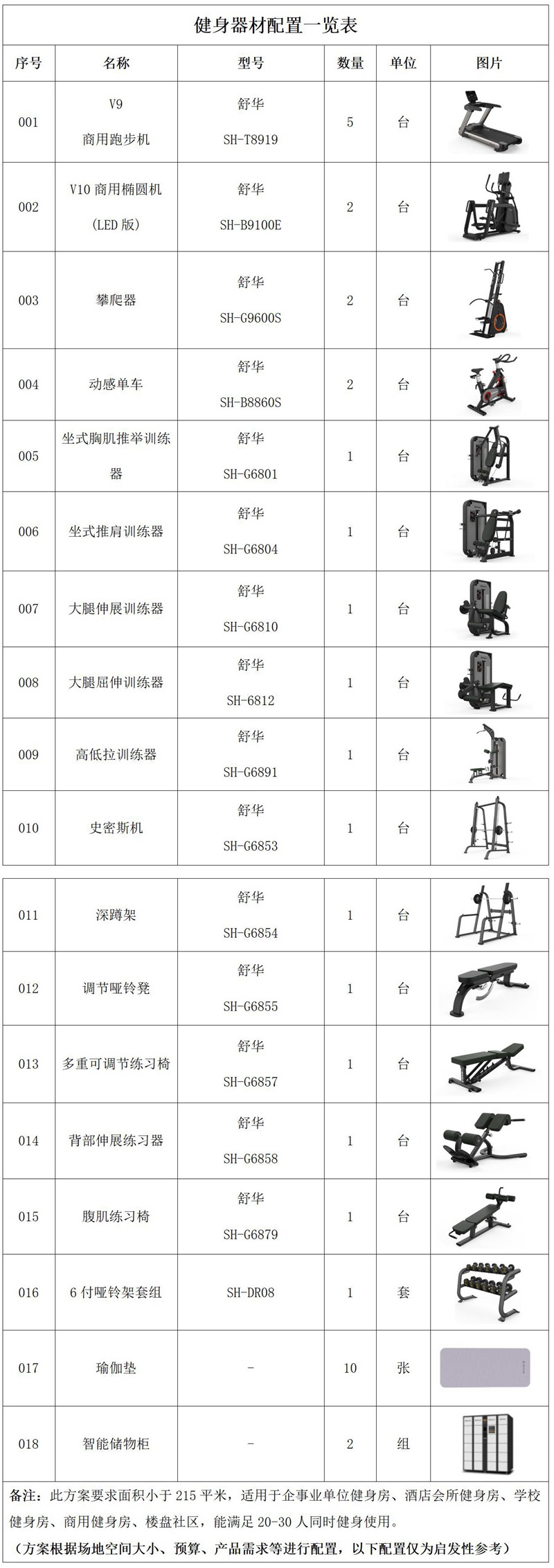 此方案要求面積小于215平米,適用于企事業(yè)單位健身房、酒店會所健身房、學(xué)校健身房、商用健身房、樓盤社區(qū),能滿足20-30人同時健身使用。(方案根據(jù)場地空間大小、預(yù)算、產(chǎn)品需求等進(jìn)行配置,以下配置僅為啟發(fā)性參考)