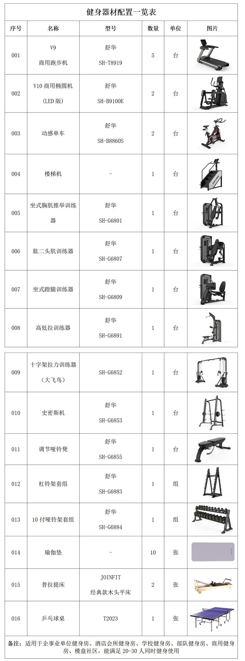 此方案要求面積小于220平米,適用于企事業(yè)單位健身房、酒店會(huì)所健身房、學(xué)校健身房、部隊(duì)健身房、商用健身房、樓盤(pán)社區(qū),能滿足20-30人同時(shí)健身使用。