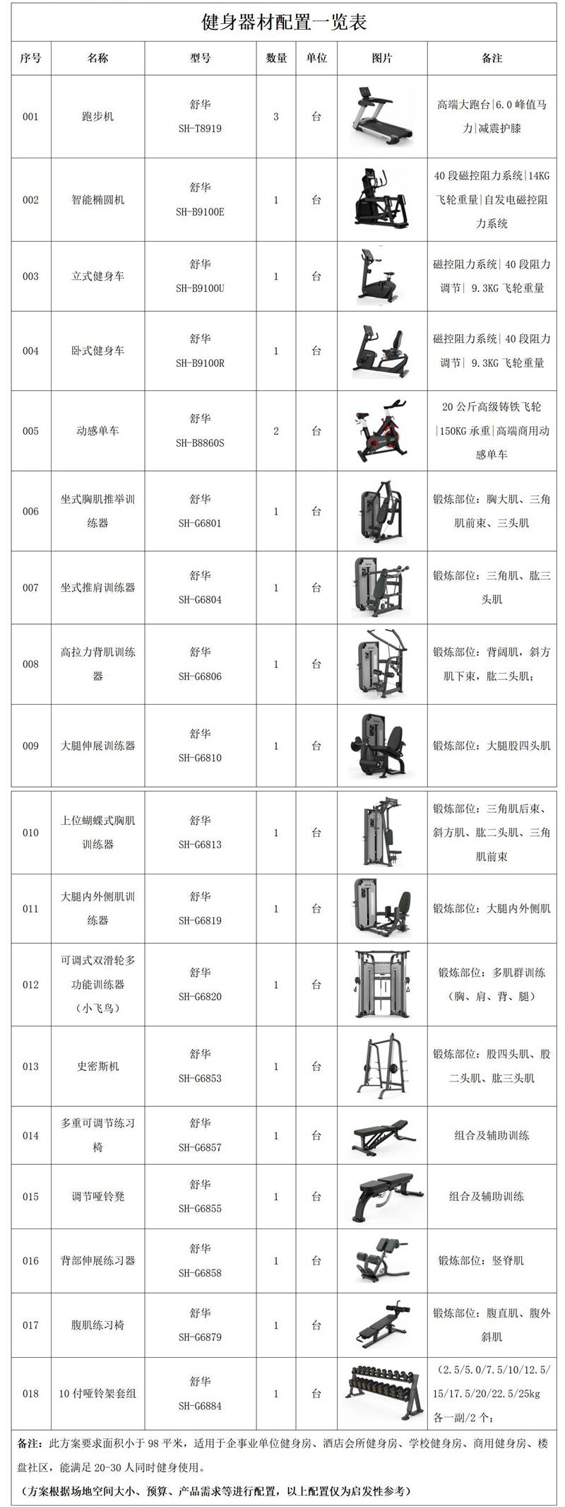 此方案要求面積小于98平米,適用于企事業(yè)單位健身房、酒店會(huì)所健身房、學(xué)校健身房、商用健身房、樓盤社區(qū),能滿足15-25人同時(shí)健身使用。(方案根據(jù)場(chǎng)地空間大小、預(yù)算、產(chǎn)品需求等進(jìn)行配置,以下配置僅為啟發(fā)性參考)