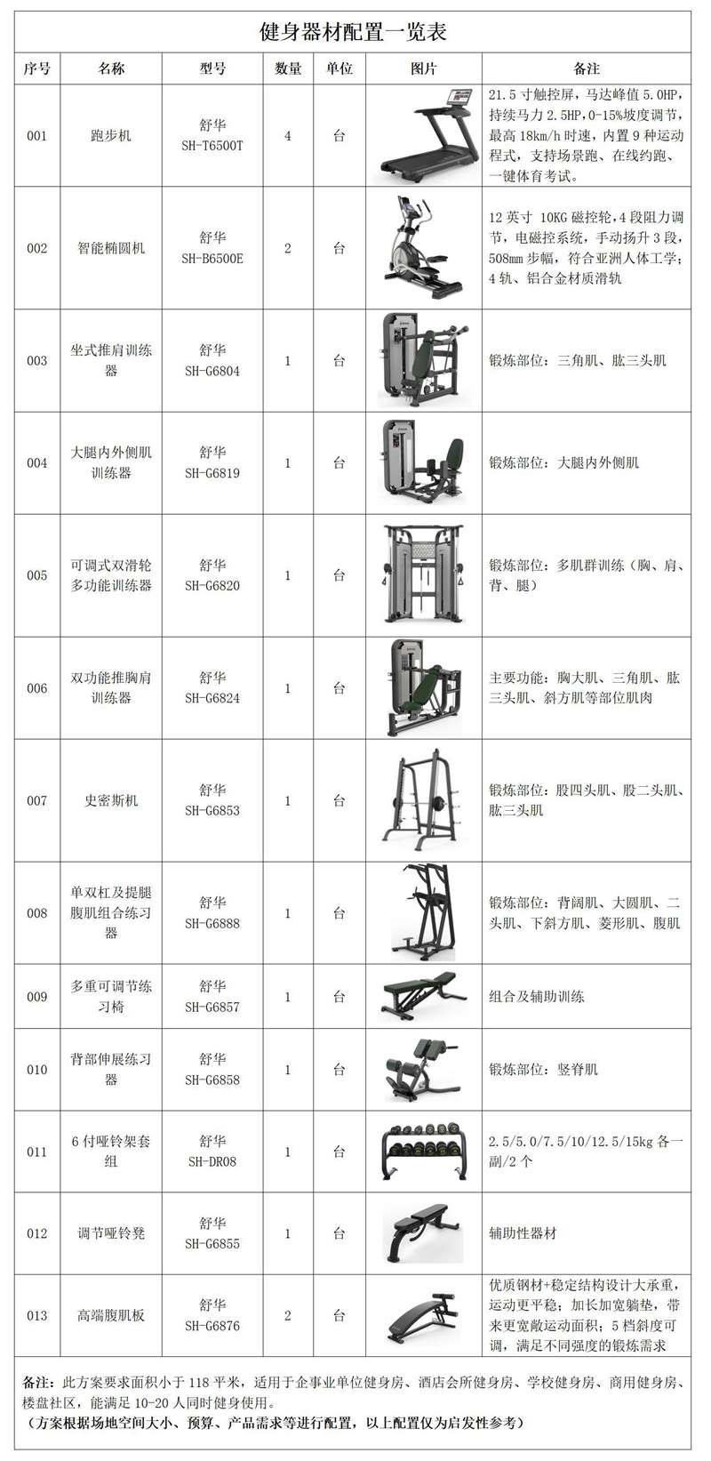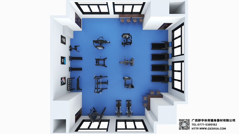 此方案要求面積小于118平米,適用于企事業(yè)單位健身房、酒店會(huì)所健身房、樓盤(pán)社區(qū)健身房,能滿足20-30人同時(shí)健身使用。(方案根據(jù)場(chǎng)地空間大小、預(yù)算、產(chǎn)品需求等進(jìn)行配置僅為啟發(fā)性參考)