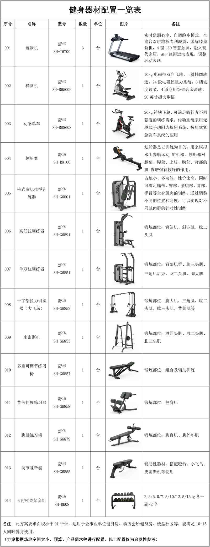 此方案要求面積小于91m2,適用于企事業(yè)單位、酒店會所、樓盤社區(qū)、學(xué)校等健身場所,能滿足10-15人同時健身使用。(方案根據(jù)場地空間大小、預(yù)算、產(chǎn)品需求等進(jìn)行配置僅為啟發(fā)性參考)