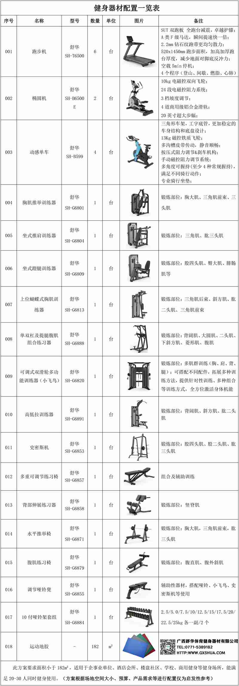此方案要求面積小于182m2,適用于企事業(yè)單位、酒店會所、樓盤社區(qū)、學(xué)校、商用健身等健身場所,能滿足20-30人同時(shí)健身使用。(方案根據(jù)場地空間大小、預(yù)算、產(chǎn)品需求等進(jìn)行配置僅為啟發(fā)性參考)