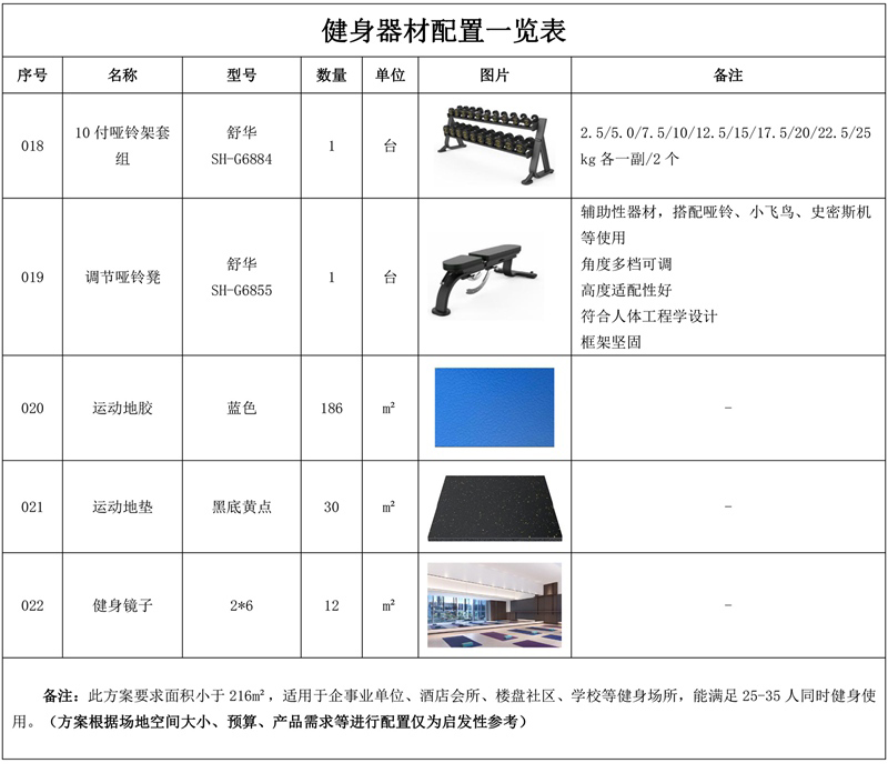 此方案要求面積小于216m2,適用于企事業(yè)單位、酒店會(huì)所、樓盤社區(qū)、學(xué)校等健身場(chǎng)所,能滿足25-35人同時(shí)健身使用。(方案根據(jù)場(chǎng)地空間大小、預(yù)算、產(chǎn)品需求等進(jìn)行配置僅為啟發(fā)性參考)