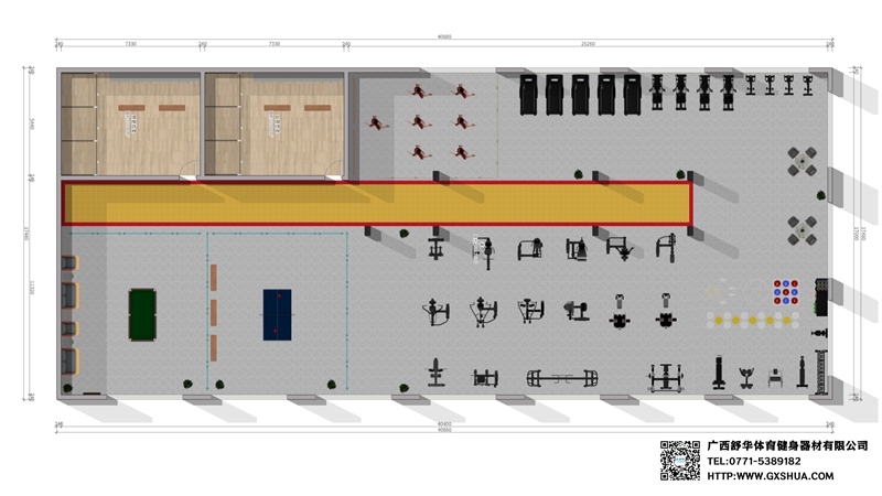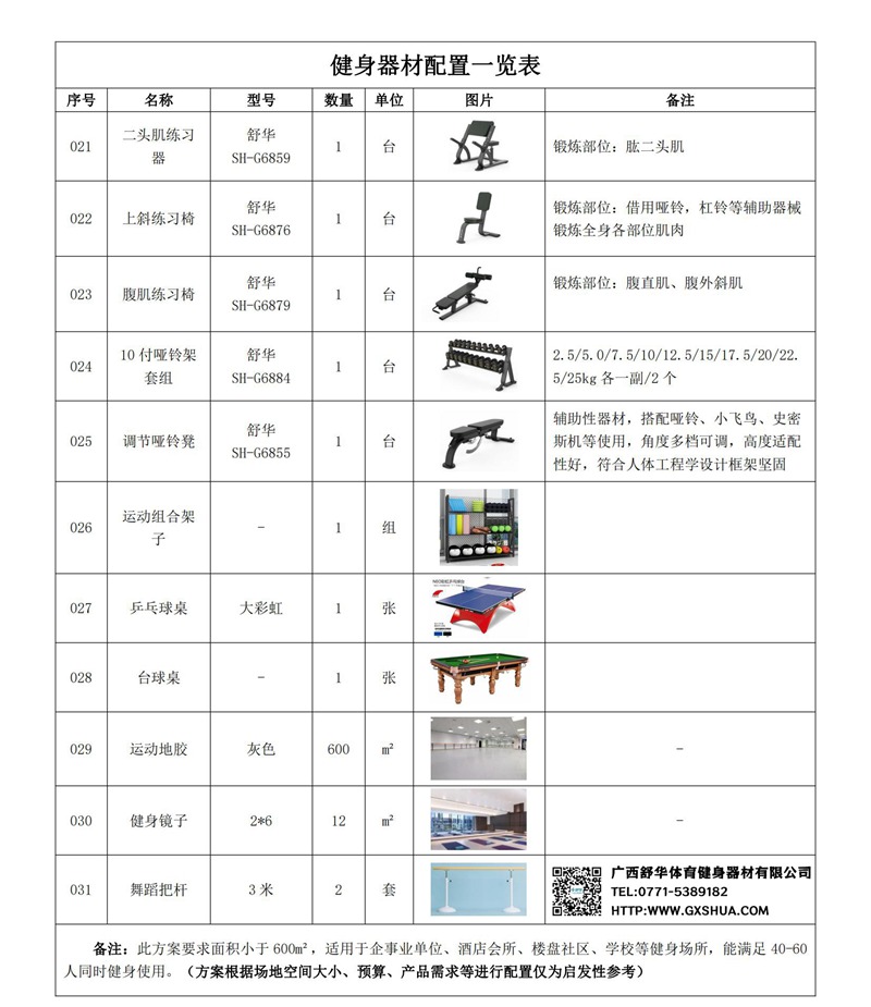 此方案要求面積小于600m2,適用于企事業(yè)單位、酒店會所、樓盤社區(qū)、學校、商用健身房等健身場所,能滿足40-60人同時健身使用。(方案根據場地空間大小、預算、產品需求等進行配置僅為啟發(fā)性參考)