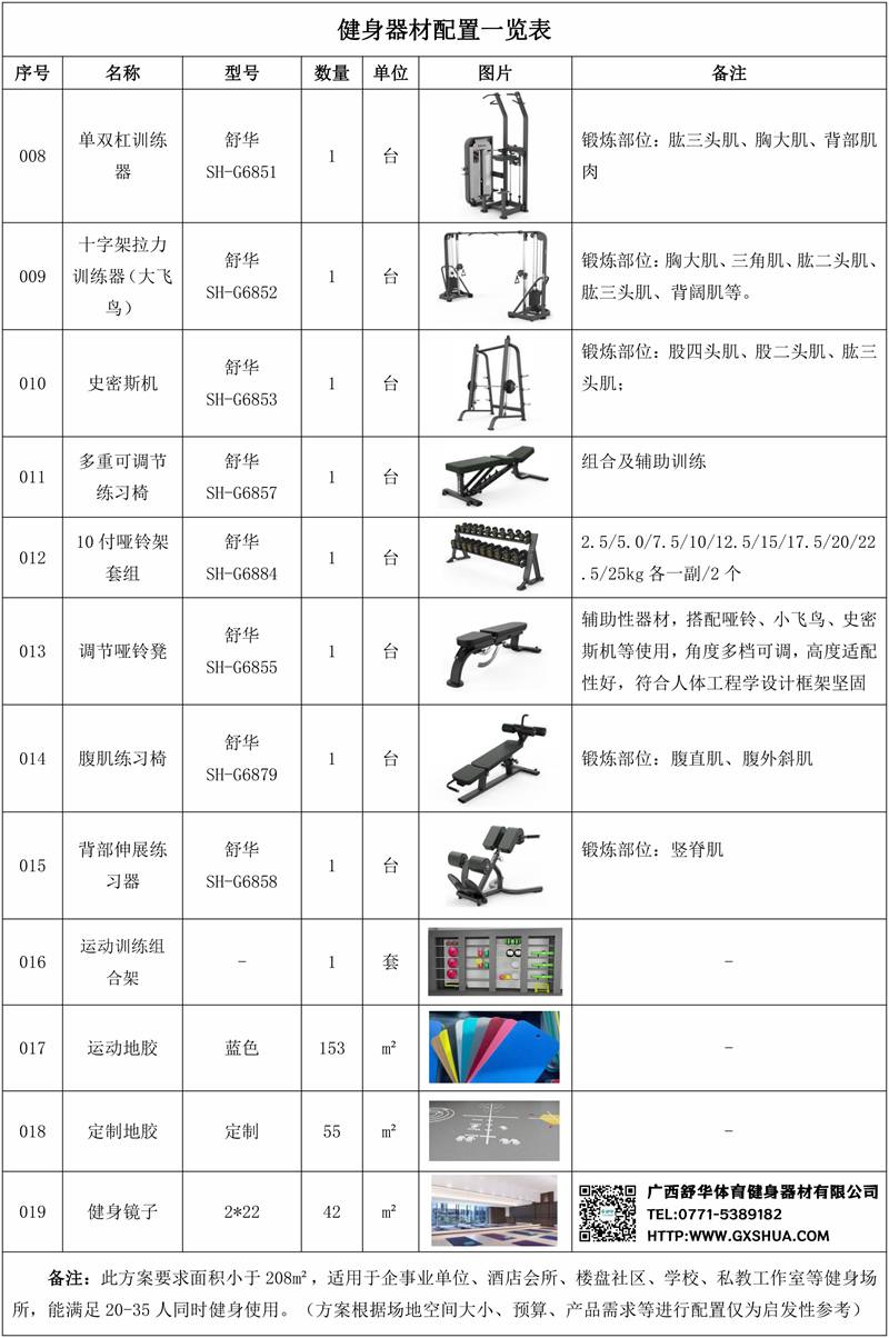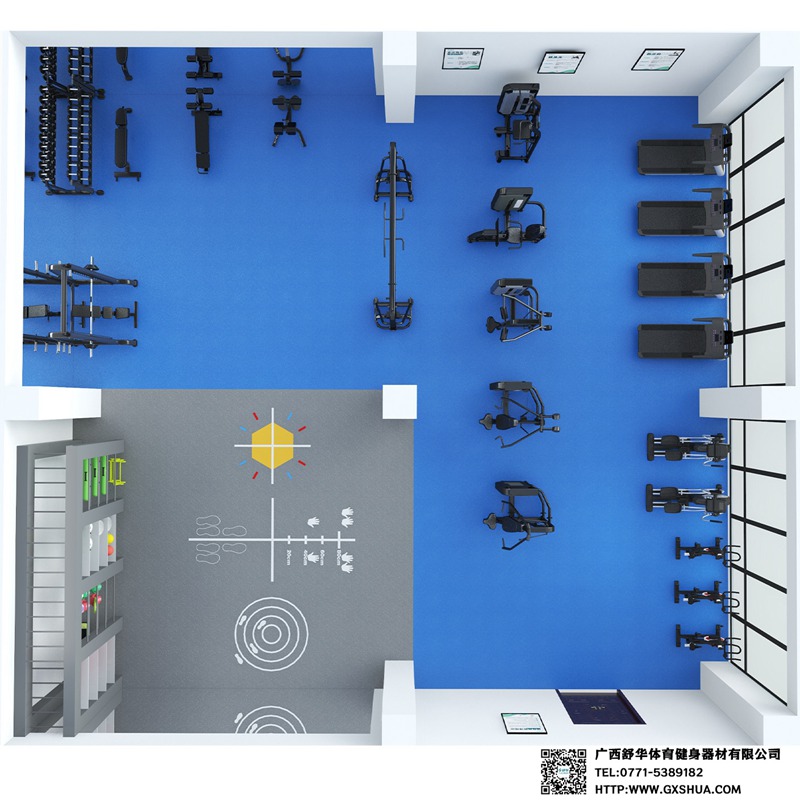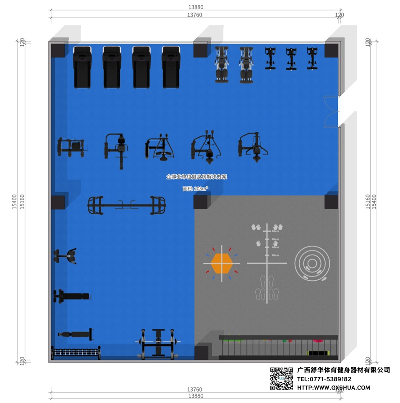 此方案要求面積小于208m2,適用于企事業(yè)單位、酒店會(huì)所、樓盤(pán)社區(qū)、學(xué)校、私教工作室等健身場(chǎng)所,能滿(mǎn)足20-35人同時(shí)健身使用。(方案根據(jù)場(chǎng)地空間大小、預(yù)算、產(chǎn)品需求等進(jìn)行配置僅為啟發(fā)性參考)
