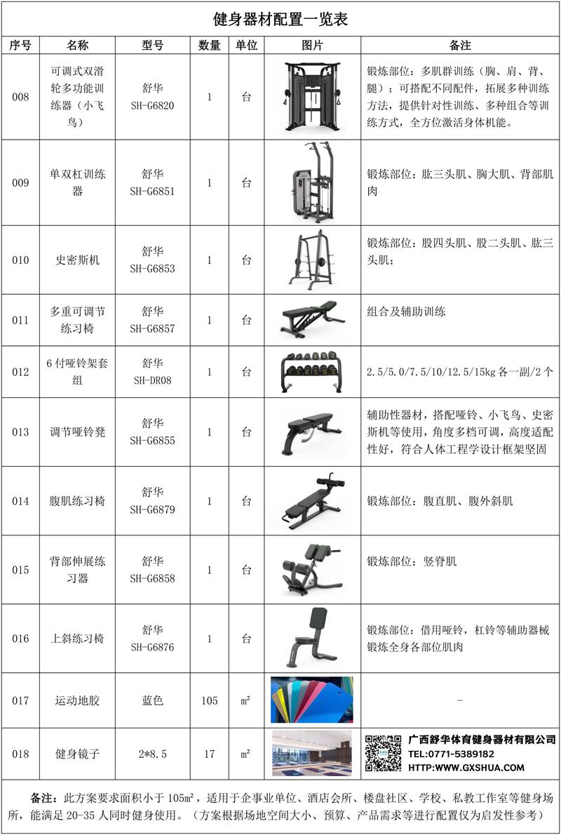 此方案要求面積小于105m2,適用于企事業(yè)單位、酒店會(huì)所、樓盤社區(qū)、學(xué)校、私教工作室等健身場(chǎng)所,能滿足20-35人同時(shí)健身使用。(方案根據(jù)場(chǎng)地空間大小、預(yù)算、產(chǎn)品需求等進(jìn)行配置僅為啟發(fā)性參考)