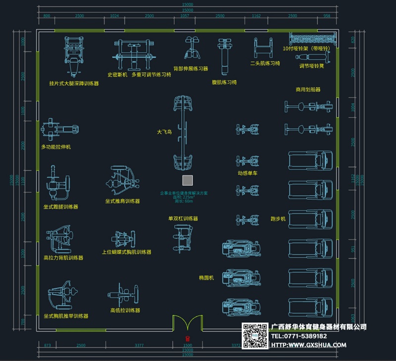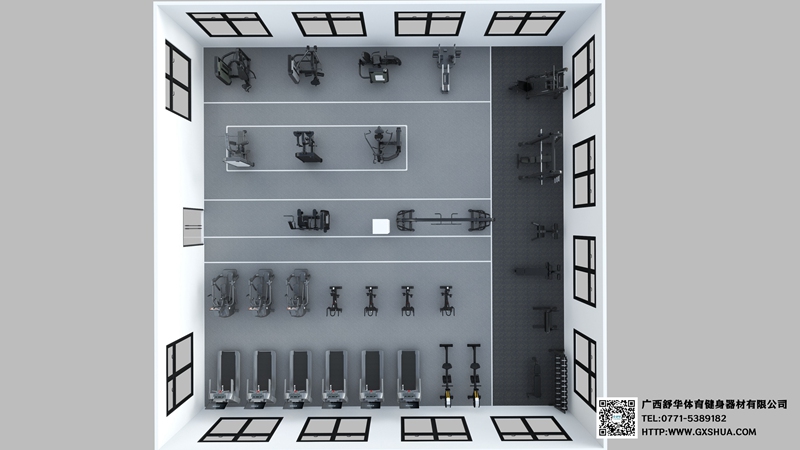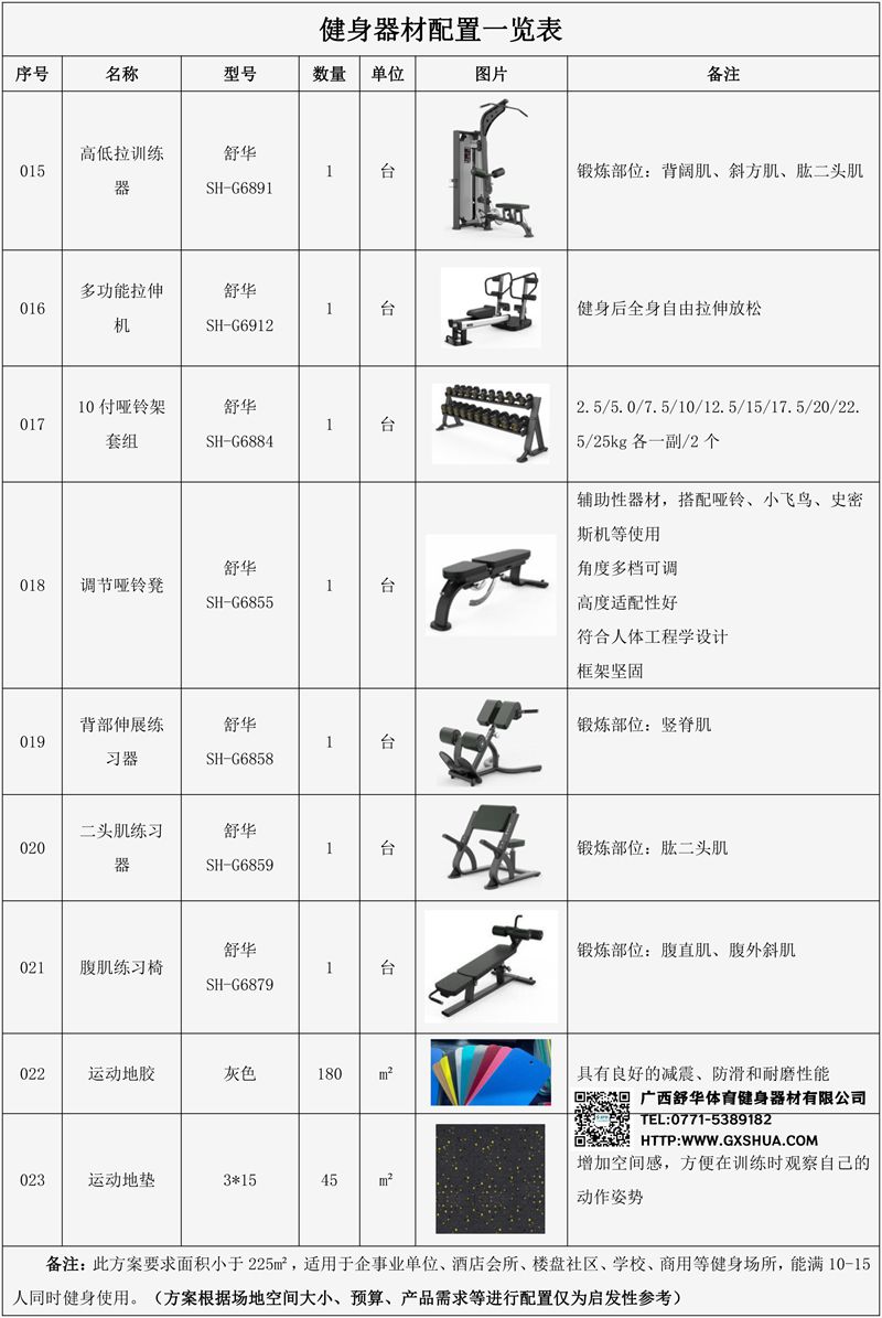 此方案要求面積小于225m2,適用于企事業(yè)單位、酒店會所、樓盤社區(qū)、學校、商用等健身場所,能滿10-15人同時健身使用。(方案根據(jù)場地空間大小、預算、產(chǎn)品需求等進行配置僅為啟發(fā)性參考)
