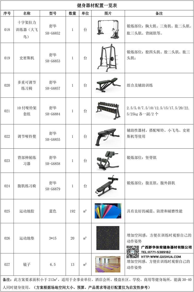 此方案要求面積小于212m2,適用于企事業(yè)單位、酒店會所、樓盤社區(qū)、學(xué)校、商用等健身場所,能滿30-40人同時健身使用。(方案根據(jù)場地空間大小、預(yù)算、產(chǎn)品需求等進(jìn)行配置僅為啟發(fā)性參考)
