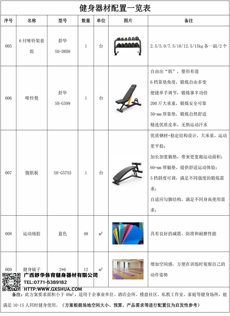 此方案要求面積小于48m2,適用于企事業(yè)單位、酒店會(huì)所、樓盤社區(qū)、私教工作室、家庭等健身場(chǎng)所,能滿足10-15人同時(shí)健身使用。(方案根據(jù)場(chǎng)地空間大小、預(yù)算、產(chǎn)品需求等進(jìn)行配置僅為啟發(fā)性參考)