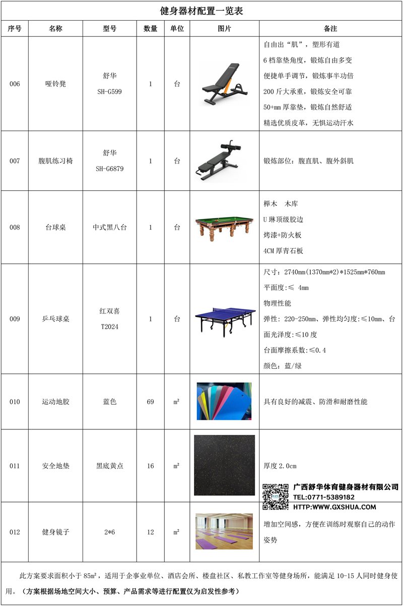 此方案要求面積小于85m2,適用于企事業(yè)單位、酒店會(huì)所、樓盤(pán)社區(qū)、私教工作室等健身場(chǎng)所,能滿足10-15人同時(shí)健身使用。(方案根據(jù)場(chǎng)地空間大小、預(yù)算、產(chǎn)品需求等進(jìn)行配置僅為啟發(fā)性參考)