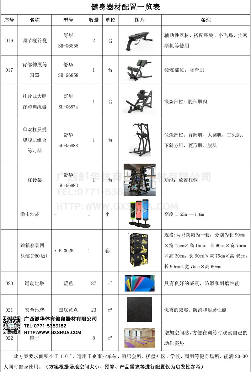 此方案要求面積小于110m2,適用于企事業(yè)單位、酒店會所、樓盤社區(qū)、學(xué)校、商用等健身場所,能滿20-30人同時健身使用。(方案根據(jù)場地空間大小、預(yù)算、產(chǎn)品需求等進(jìn)行配置僅為啟發(fā)性參考)