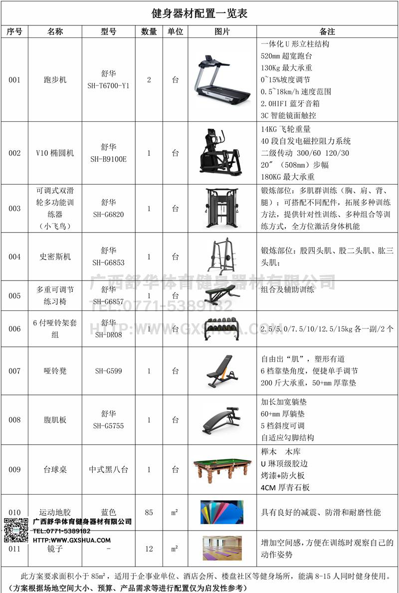 此方案要求面積小于85m2,適用于企事業(yè)單位、酒店會(huì)所、樓盤(pán)社區(qū)等健身場(chǎng)所,能滿8-15人同時(shí)健身使用。(方案根據(jù)場(chǎng)地空間大小、預(yù)算、產(chǎn)品需求等進(jìn)行配置僅為啟發(fā)性參考)
