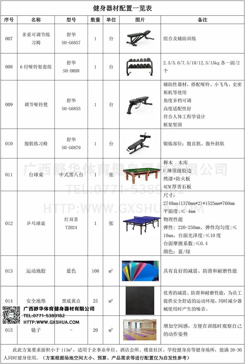 此方案要求面積小于113m2,適用于企事業(yè)單位、酒店會(huì)所、樓盤社區(qū)、學(xué)校健身房等健身場所,能滿20-30人同時(shí)健身使用。(方案根據(jù)場地空間大小、預(yù)算、產(chǎn)品需求等進(jìn)行配置僅為啟發(fā)性參考)