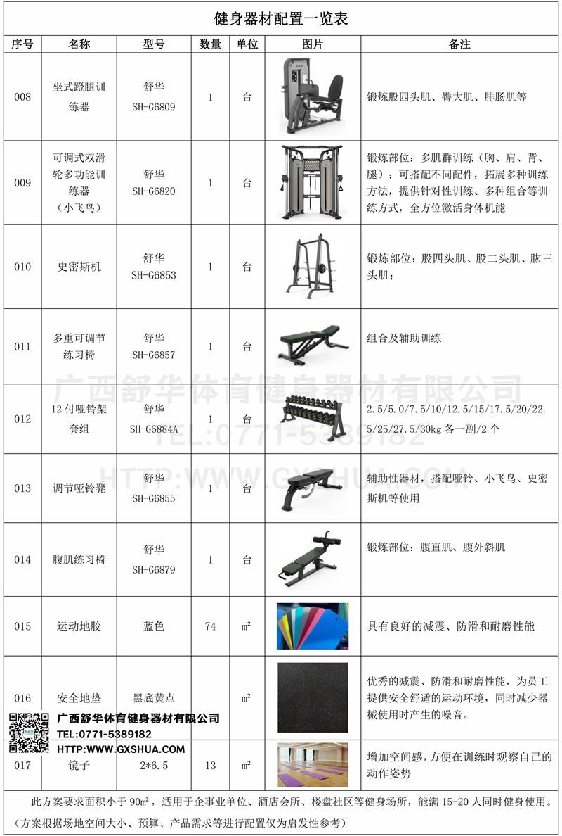 此方案要求面積小于90m2,適用于企事業(yè)單位、酒店會所、樓盤社區(qū)等健身場所,能滿15-20人同時健身使用。(方案根據(jù)場地空間大小、預算、產(chǎn)品需求等進行配置僅為啟發(fā)性參考)
