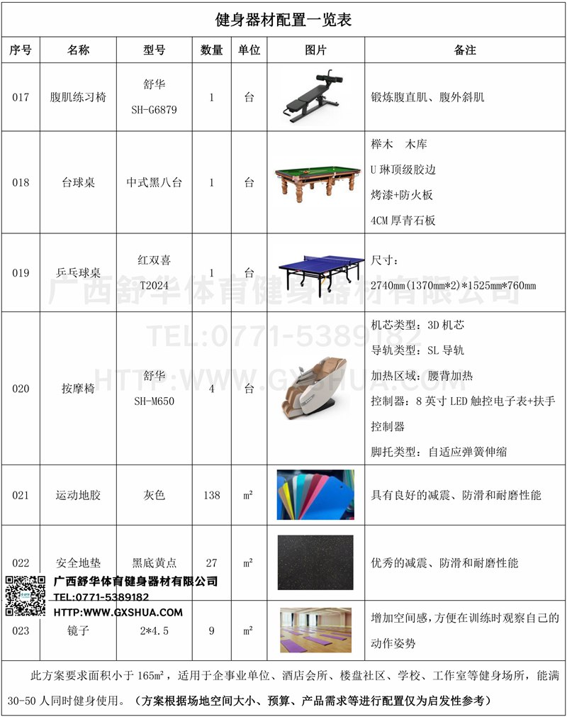 此方案要求面積小于165m2,適用于企事業(yè)單位、酒店會(huì)所、樓盤社區(qū)、學(xué)校、工作室等健身場(chǎng)所,能滿30-50人同時(shí)健身使用。(方案根據(jù)場(chǎng)地空間大小、預(yù)算、產(chǎn)品需求等進(jìn)行配置僅為啟發(fā)性參考)
