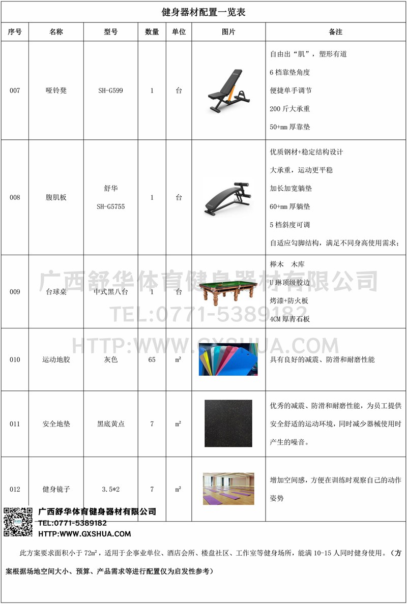 此方案要求面積小于72m2,適用于企事業(yè)單位、酒店會(huì)所、樓盤(pán)社區(qū)、工作室等健身場(chǎng)所,能滿(mǎn)10-15人同時(shí)健身使用。(方案根據(jù)場(chǎng)地空間大小、預(yù)算、產(chǎn)品需求等進(jìn)行配置僅為啟發(fā)性參考)