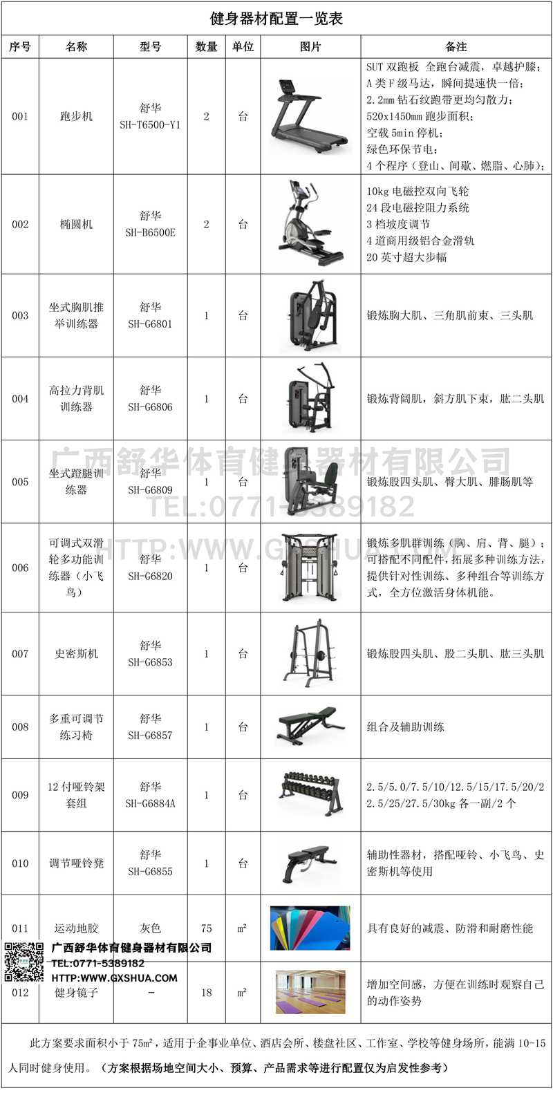 此方案要求面積小于75m2,適用于企事業(yè)單位、酒店會(huì)所、樓盤社區(qū)、工作室、學(xué)校等健身場(chǎng)所,能滿10-15人同時(shí)健身使用。(方案根據(jù)場(chǎng)地空間大小、預(yù)算、產(chǎn)品需求等進(jìn)行配置僅為啟發(fā)性參考)