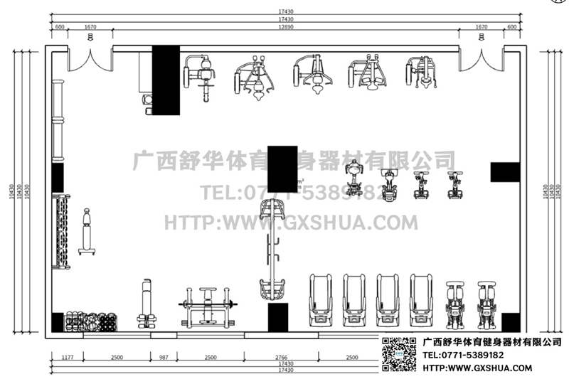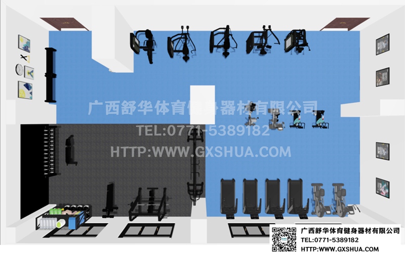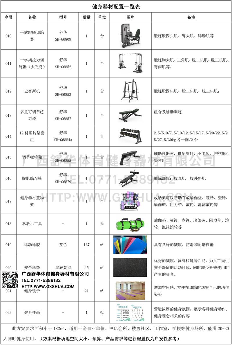 此方案要求面積小于182m2,適用于企事業(yè)單位、酒店會所、樓盤社區(qū)、工作室、學(xué)校等健身場所,能滿20-30人同時健身使用。(方案根據(jù)場地空間大小、預(yù)算、產(chǎn)品需求等進行配置僅為啟發(fā)性參考)