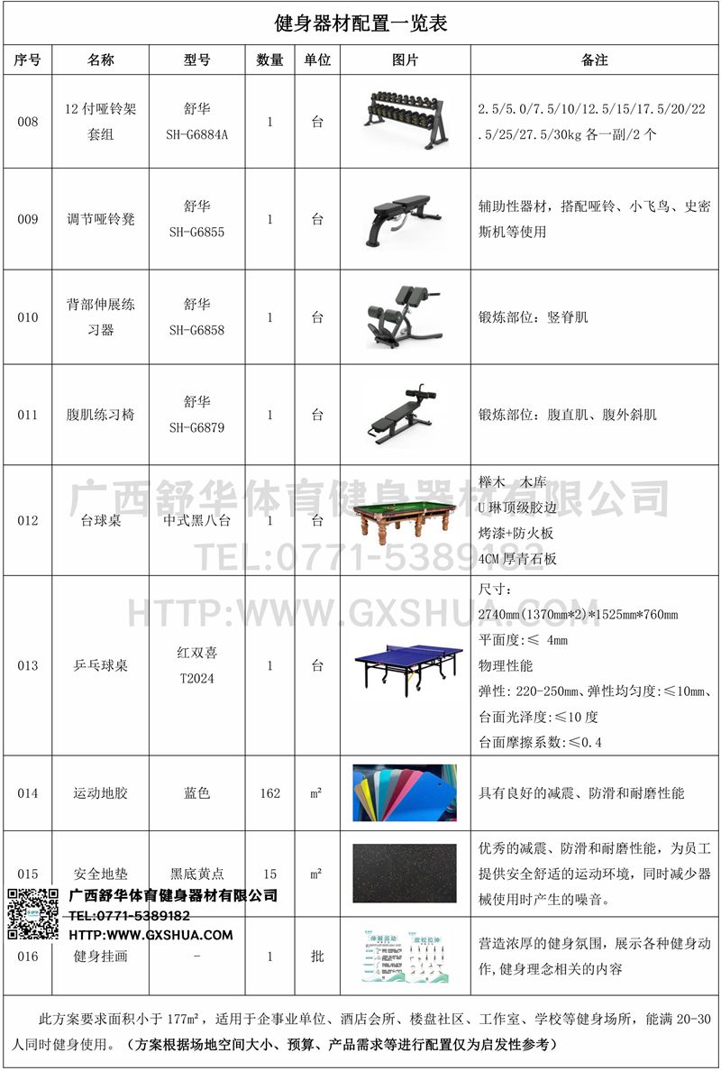 此方案要求面積小于177m2,適用于企事業(yè)單位、酒店會所、樓盤社區(qū)、工作室、學(xué)校等健身場所,能滿20-30人同時健身使用。(方案根據(jù)場地空間大小、預(yù)算、產(chǎn)品需求等進(jìn)行配置僅為啟發(fā)性參考)