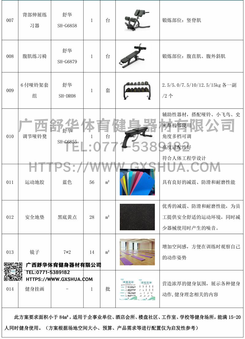 此方案要求面積小于84m2,適用于企事業(yè)單位、酒店會(huì)所、樓盤社區(qū)、工作室、學(xué)校等健身場(chǎng)所,能滿15-20人同時(shí)健身使用。(方案根據(jù)場(chǎng)地空間大小、預(yù)算、產(chǎn)品需求等進(jìn)行配置僅為啟發(fā)性參考)