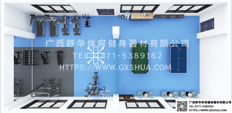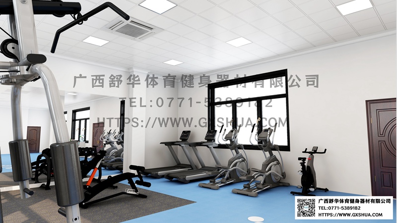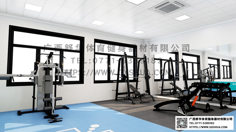 G6853史密斯機*1臺,G5755腹肌板*1臺,6付啞鈴套組*1套,G599啞鈴凳*1張,滿足肌肉訓練需求。鋪設防滑、減震的地墊,為員工提供安全舒適的運動環(huán)境,同時減少器械使用時產生的噪音,安裝大面積的鏡子,增加空間的視覺感,方便員工在訓練時觀察自己的動作姿勢,保證訓練效果和安全性。