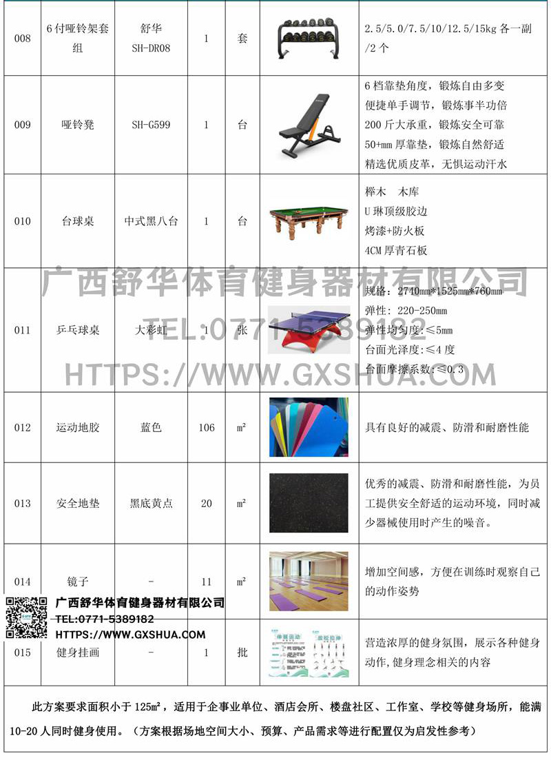此方案要求面積小于125m2,適用于企事業(yè)單位、酒店會所、樓盤社區(qū)、工作室、學校等健身場所,能滿10-20人同時健身使用。(方案根據(jù)場地空間大小、預算、產品需求等進行配置僅為啟發(fā)性參考)