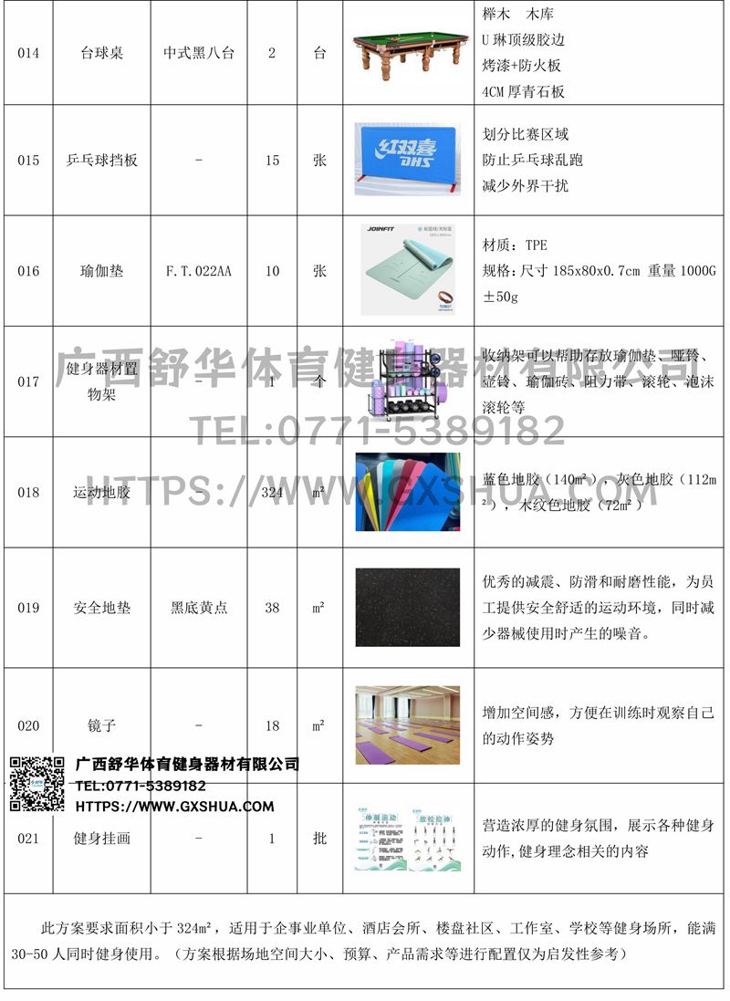 此方案要求面積小于324m2,適用于企事業(yè)單位、酒店會所、樓盤社區(qū)、工作室、學校等健身場所,能滿30-50人同時健身使用。(方案根據(jù)場地空間大小、預算、產(chǎn)品需求等進行配置僅為啟發(fā)性參考)