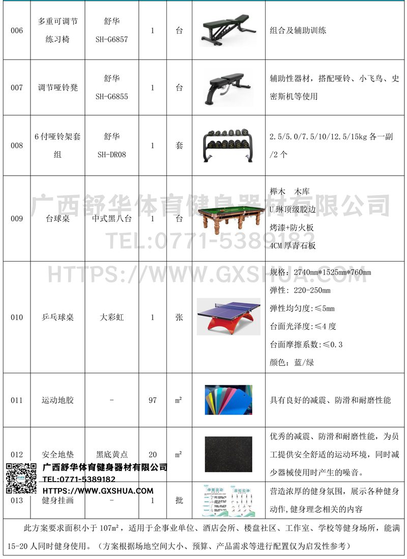 此方案要求面積小于107m2,適用于企事業(yè)單位、酒店會(huì)所、樓盤社區(qū)、工作室、學(xué)校等健身場(chǎng)所,能滿15-20人同時(shí)健身使用。(方案根據(jù)場(chǎng)地空間大小、預(yù)算、產(chǎn)品需求等進(jìn)行配置僅為啟發(fā)性參考)