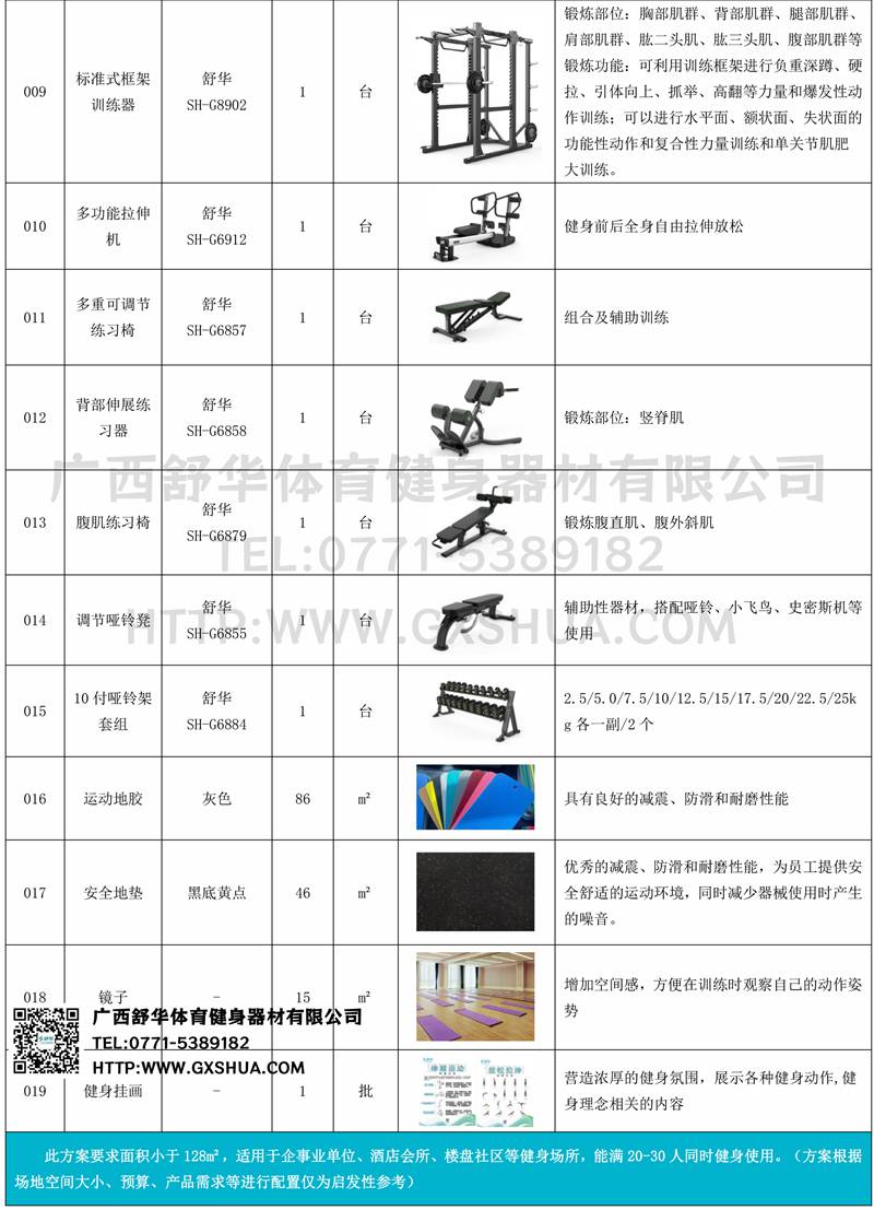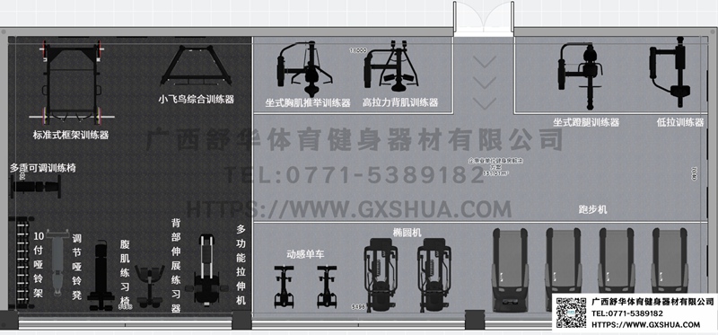 此方案要求面積小于132m2,適用于企事業(yè)單位、酒店會所、樓盤社區(qū)、學校等健身場所,能滿20-30人同時健身使用。(方案根據(jù)場地空間大小、預算、產(chǎn)品需求等進行配置僅為啟發(fā)性參考)