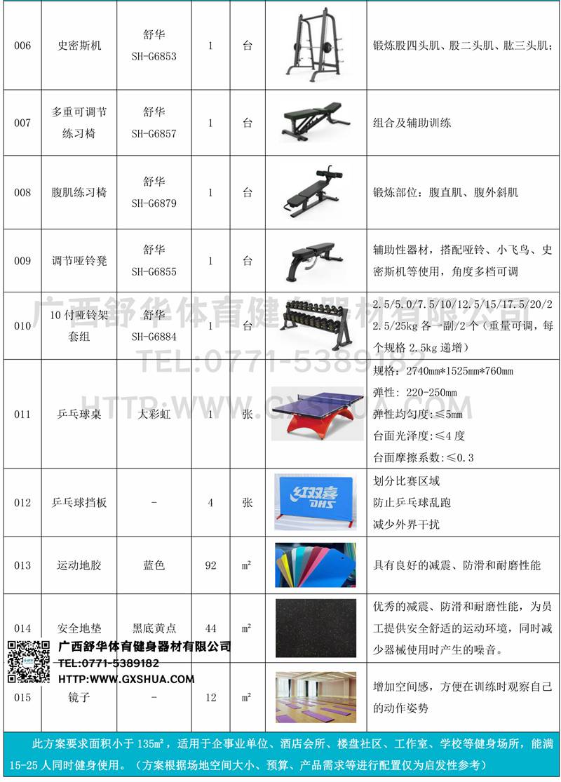 此方案要求面積小于135m2,適用于企事業(yè)單位、酒店會(huì)所、樓盤社區(qū)、工作室、學(xué)校等健身場(chǎng)所,能滿15-25人同時(shí)健身使用。(方案根據(jù)場(chǎng)地空間大小、預(yù)算、產(chǎn)品需求等進(jìn)行配置僅為啟發(fā)性參考)