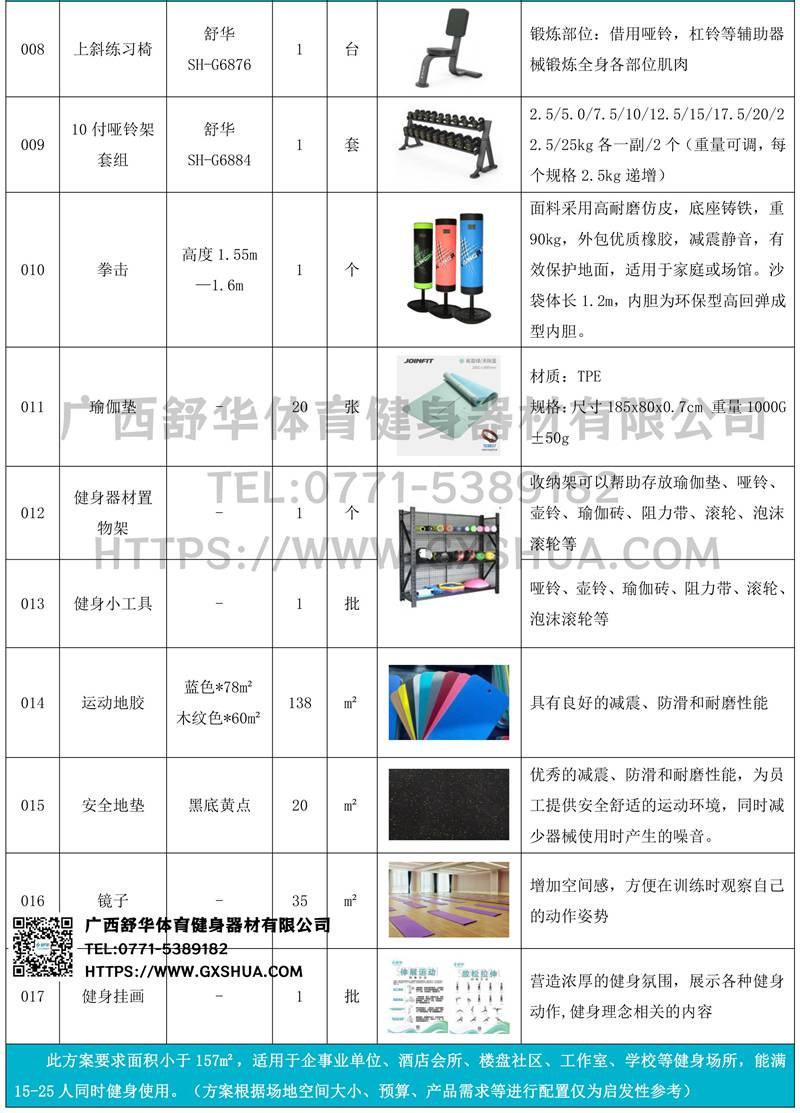此方案要求面積小于157m2,適用于企事業(yè)單位、酒店會(huì)所、樓盤社區(qū)、工作室、學(xué)校等健身場所,能滿15-25人同時(shí)健身使用。(方案根據(jù)場地空間大小、預(yù)算、產(chǎn)品需求等進(jìn)行配置僅為啟發(fā)性參考)