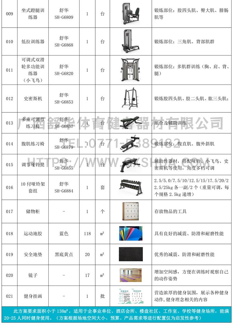 此方案要求面積小于138m2,適用于企事業(yè)單位、酒店會所、樓盤社區(qū)、工作室、學(xué)校等健身場所,能滿20-25人同時健身使用。(方案根據(jù)場地空間大小、預(yù)算、產(chǎn)品需求等進行配置僅為啟發(fā)性參考)