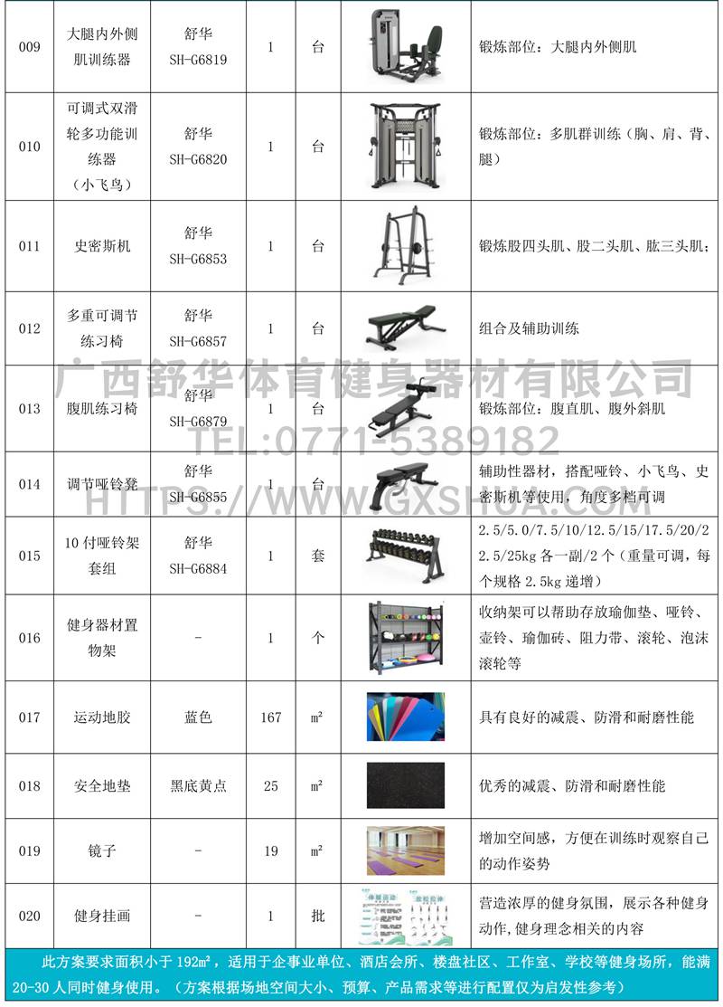 此方案要求面積小于192m2,適用于企事業(yè)單位、酒店會所、樓盤社區(qū)、工作室、學(xué)校等健身場所,能滿20-30人同時健身使用。(方案根據(jù)場地空間大小、預(yù)算、產(chǎn)品需求等進行配置僅為啟發(fā)性參考)