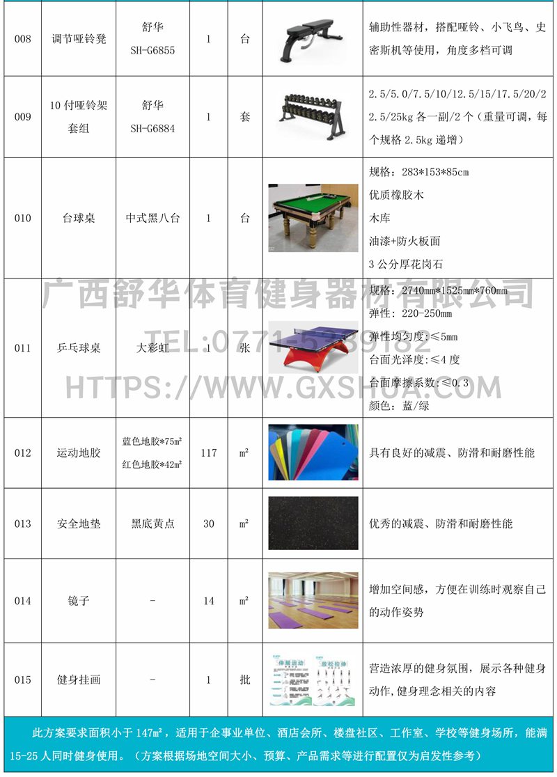 此方案要求面積小于147m2,適用于企事業(yè)單位、酒店會所、樓盤社區(qū)、工作室、學(xué)校等健身場所,能滿15-25人同時(shí)健身使用。(方案根據(jù)場地空間大小、預(yù)算、產(chǎn)品需求等進(jìn)行配置僅為啟發(fā)性參考)