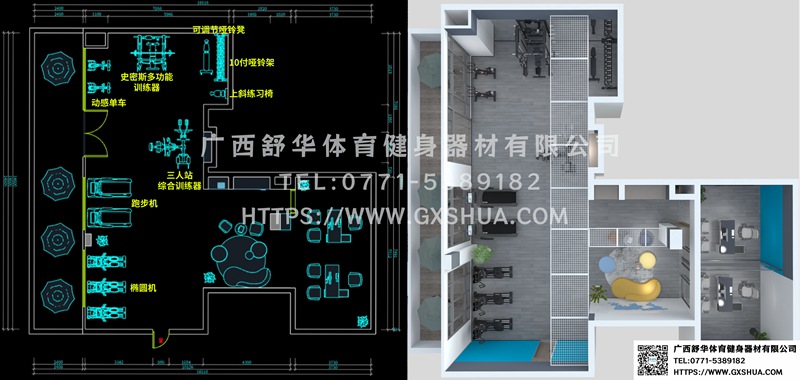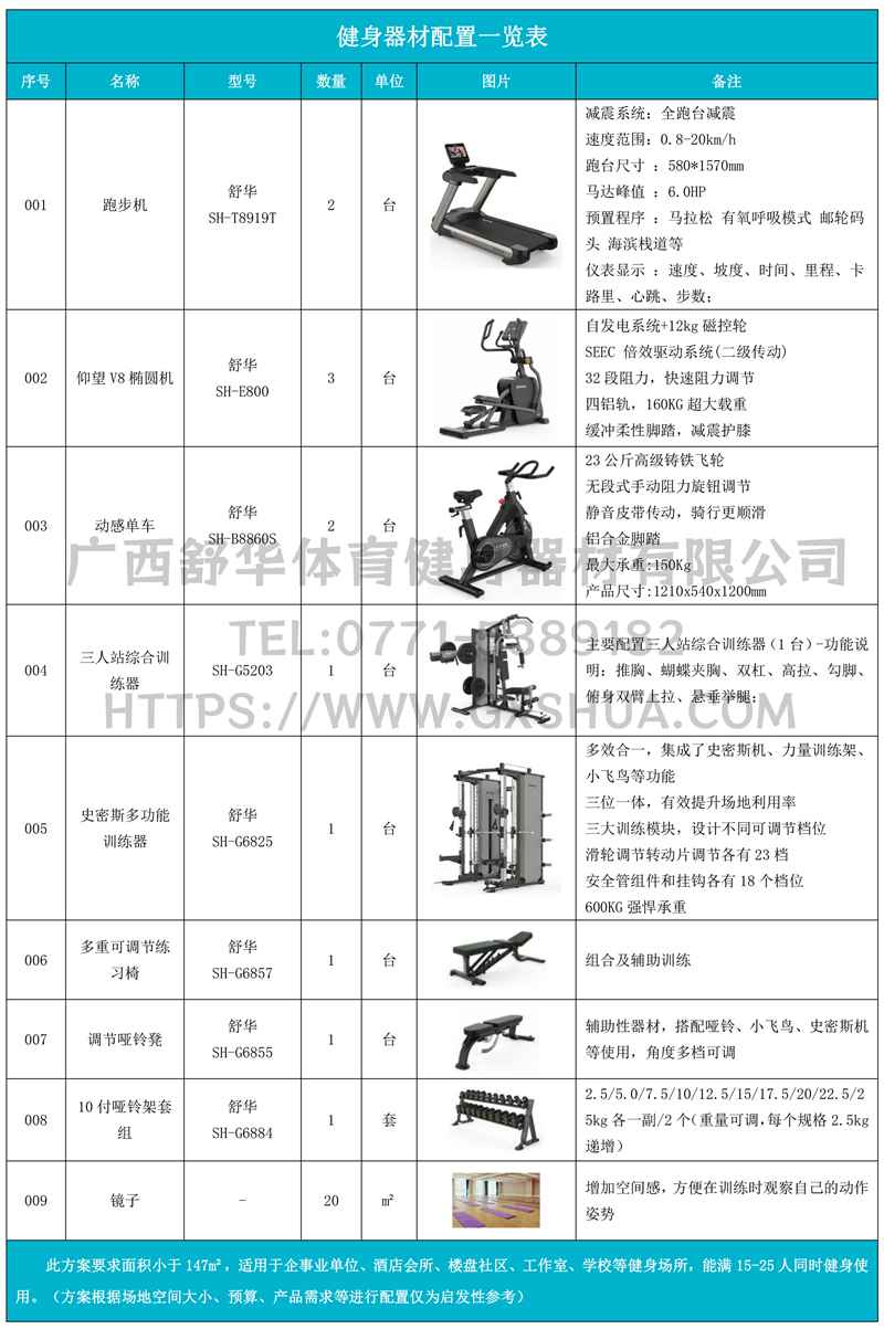 此方案要求面積小于111m2,適用于企事業(yè)單位、酒店會所、樓盤社區(qū)、工作室、學校等健身場所,能滿10-15人同時健身使用。(方案根據(jù)場地空間大小、預算、產品需求等進行配置僅為啟發(fā)性參考)