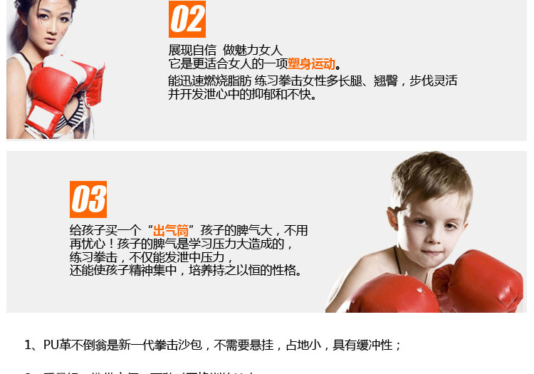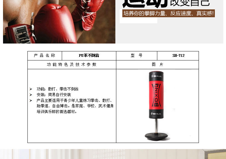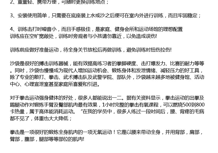 產(chǎn)品主要適用于練習(xí)拳擊、散打、跆拳道、自由搏擊。是家庭、武術(shù)健身培訓(xùn)俱樂部的首選器材