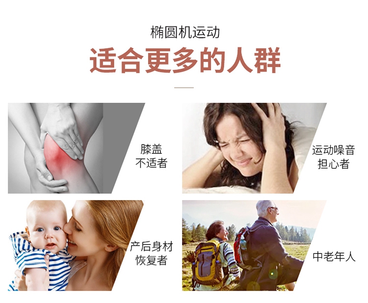 橢圓機是一種主動運動方式,能預防、降低、緩解頸椎病、肩周炎等疼痛。而且,在使用室內(nèi)健身器材-橢圓機時,因為膝蓋不是著力點,所以對膝關節(jié)的沖擊力也很小,很大程度降低了給膝蓋造成損傷的可能性,安全性大大提升,更為重要的是,室內(nèi)健身器材-橢圓機運動強度不大,適合體重過重的肥胖人群使用。它既適用于大眾人群進行鍛煉,更適合不同人群,還適合康復訓練、產(chǎn)后人群恢復訓練等。