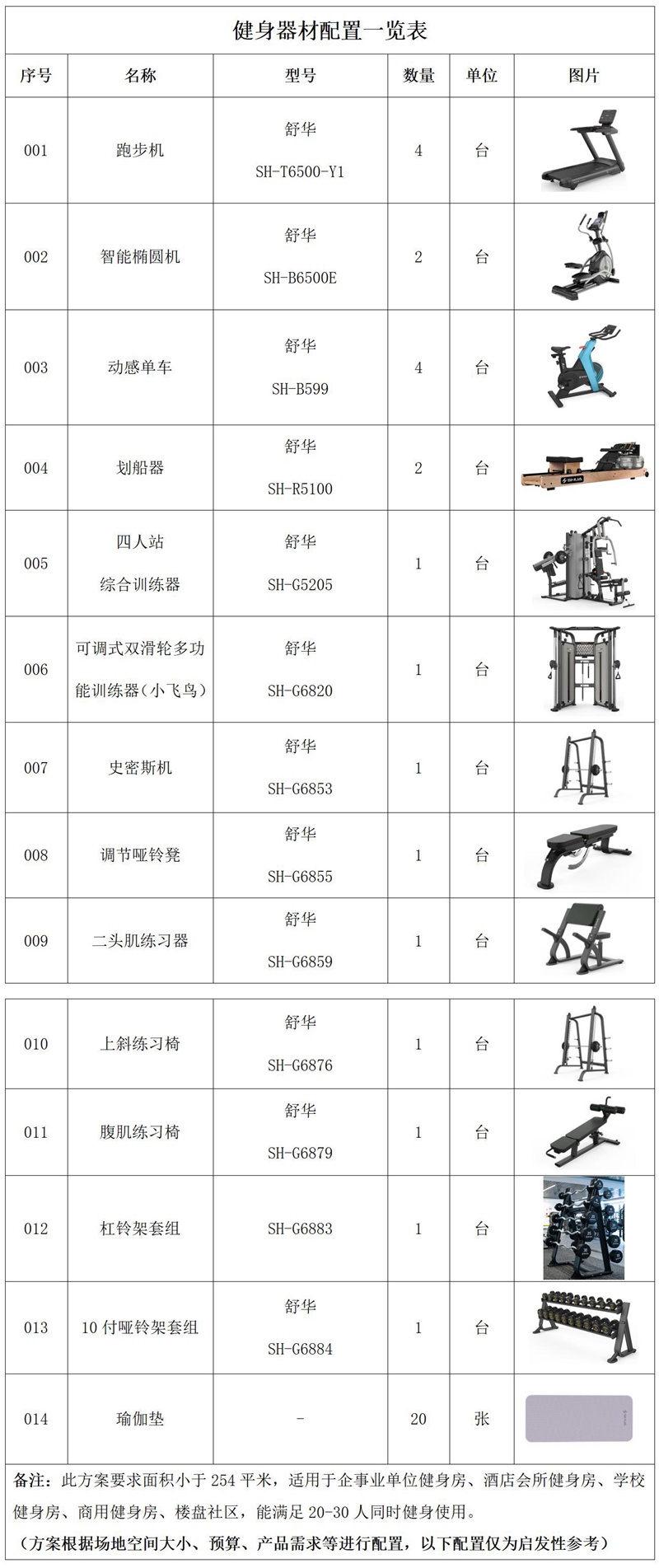 此方案要求面積小于254平米,適用于企事業(yè)單位健身房、酒店會(huì)所健身房、學(xué)校健身房、商用健身房、樓盤社區(qū),能滿足30-50人同時(shí)健身使用。(方案根據(jù)場(chǎng)地空間大小、預(yù)算、產(chǎn)品需求等進(jìn)行配置,以下配置僅為啟發(fā)性參考)