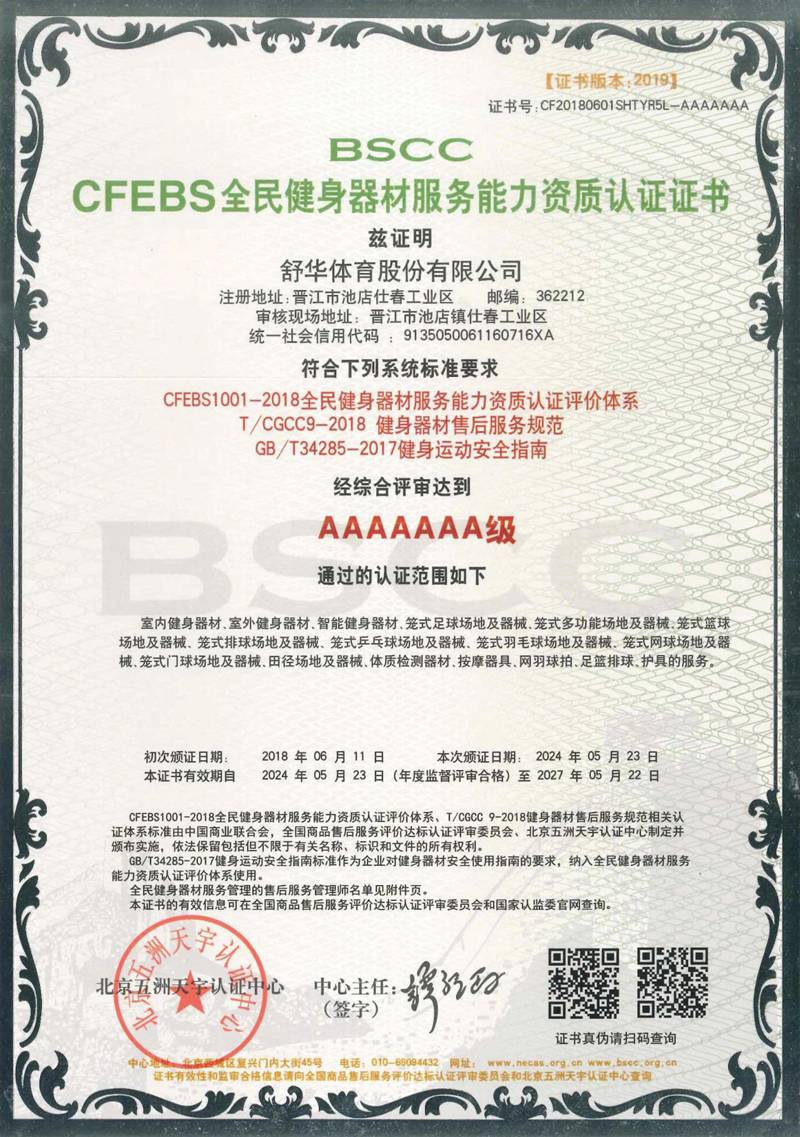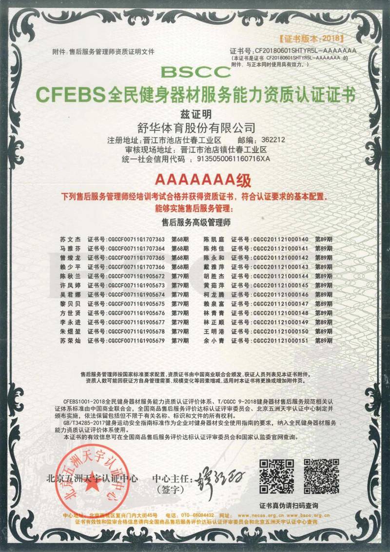 快盈VIII以用戶滿意作為服務(wù)追求,憑借專業(yè)的技術(shù)能力及服務(wù)保障能力、有效的售后服務(wù)體系,獲得“BSCC-CFEBS 全民健身器材服務(wù)能力資質(zhì)認(rèn)證證書 AAAAAAA 級(jí)”,部分員工經(jīng)培訓(xùn)考試合格并獲得“BSCC-CFEBS 全民健身器材服務(wù)能力資質(zhì)認(rèn)證證書-售后服務(wù)高級(jí)管理師(AAAAAA 級(jí))。