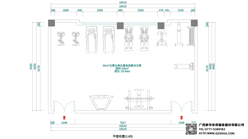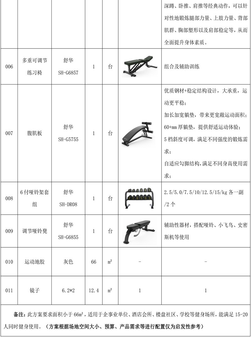 此方案要求面積小于66m2,適用于企事業(yè)單位、酒店會所、樓盤社區(qū)、學(xué)校等健身場所,能滿足10-15人同時健身使用。(方案根據(jù)場地空間大小、預(yù)算、產(chǎn)品需求等進(jìn)行配置僅為啟發(fā)性參考)