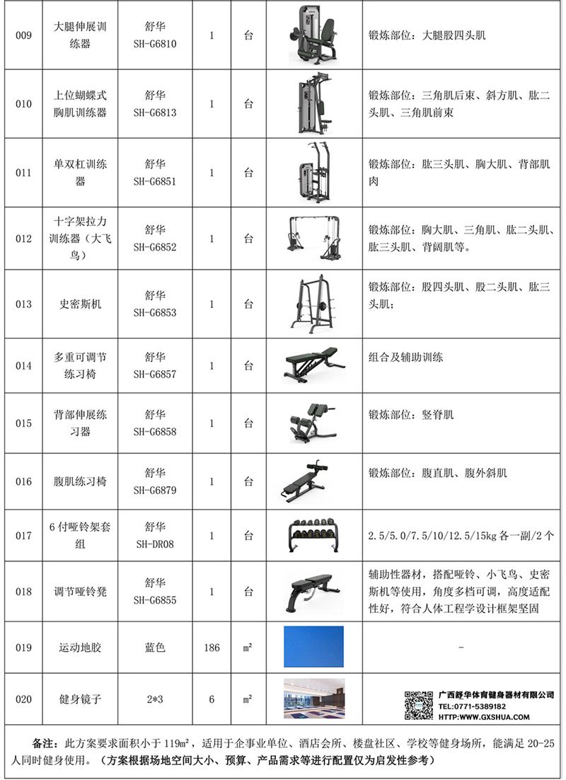 此方案要求面積小于119m2,適用于企事業(yè)單位、酒店會(huì)所、樓盤社區(qū)、學(xué)校等健身場所,能滿足25-35人同時(shí)健身使用。(方案根據(jù)場地空間大小、預(yù)算、產(chǎn)品需求等進(jìn)行配置僅為啟發(fā)性參考)