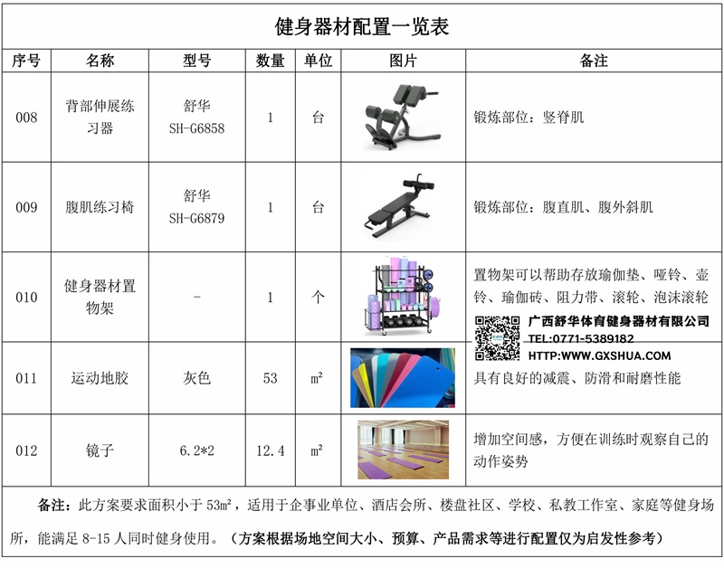 此方案要求面積小于53m2,適用于企事業(yè)單位、酒店會所、樓盤社區(qū)、學校、私教工作室、家庭等健身場所,能滿足8-15人同時健身使用。(方案根據(jù)場地空間大小、預算、產(chǎn)品需求等進行配置僅為啟發(fā)性參考)