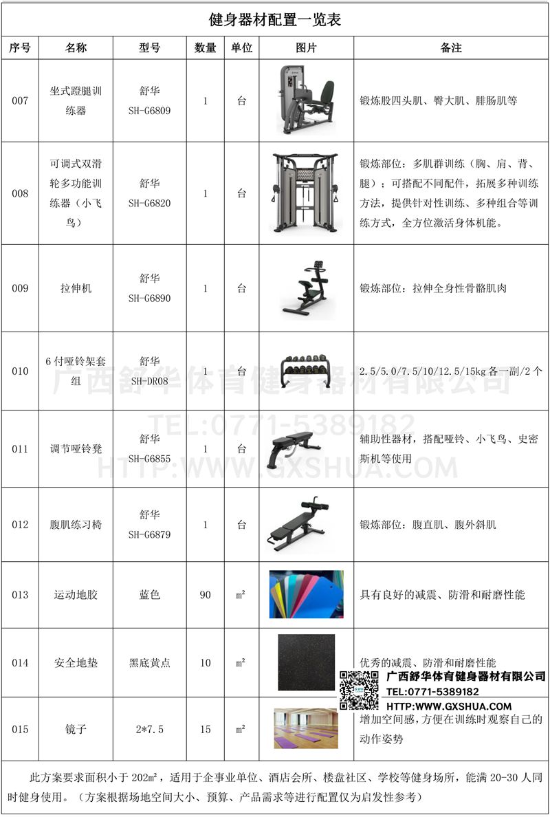 此方案要求面積小于100m2,適用于企事業(yè)單位、酒店會(huì)所、樓盤社區(qū)、學(xué)校等健身場(chǎng)所,能滿15-20人同時(shí)健身使用。(方案根據(jù)場(chǎng)地空間大小、預(yù)算、產(chǎn)品需求等進(jìn)行配置僅為啟發(fā)性參考)