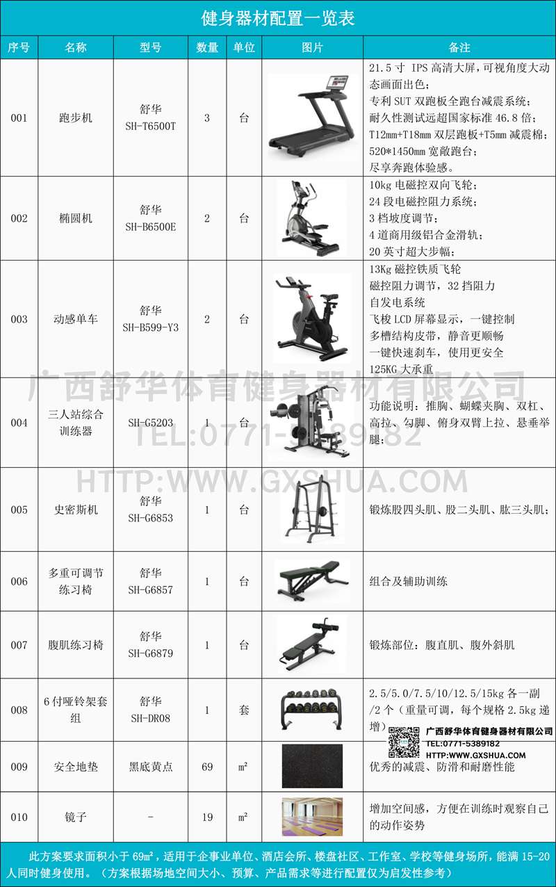 此方案要求面積小于69m2,適用于企事業(yè)單位、酒店會所、樓盤社區(qū)、工作室、學(xué)校等健身場所,能滿15-20人同時(shí)健身使用。(方案根據(jù)場地空間大小、預(yù)算、產(chǎn)品需求等進(jìn)行配置僅為啟發(fā)性參考)